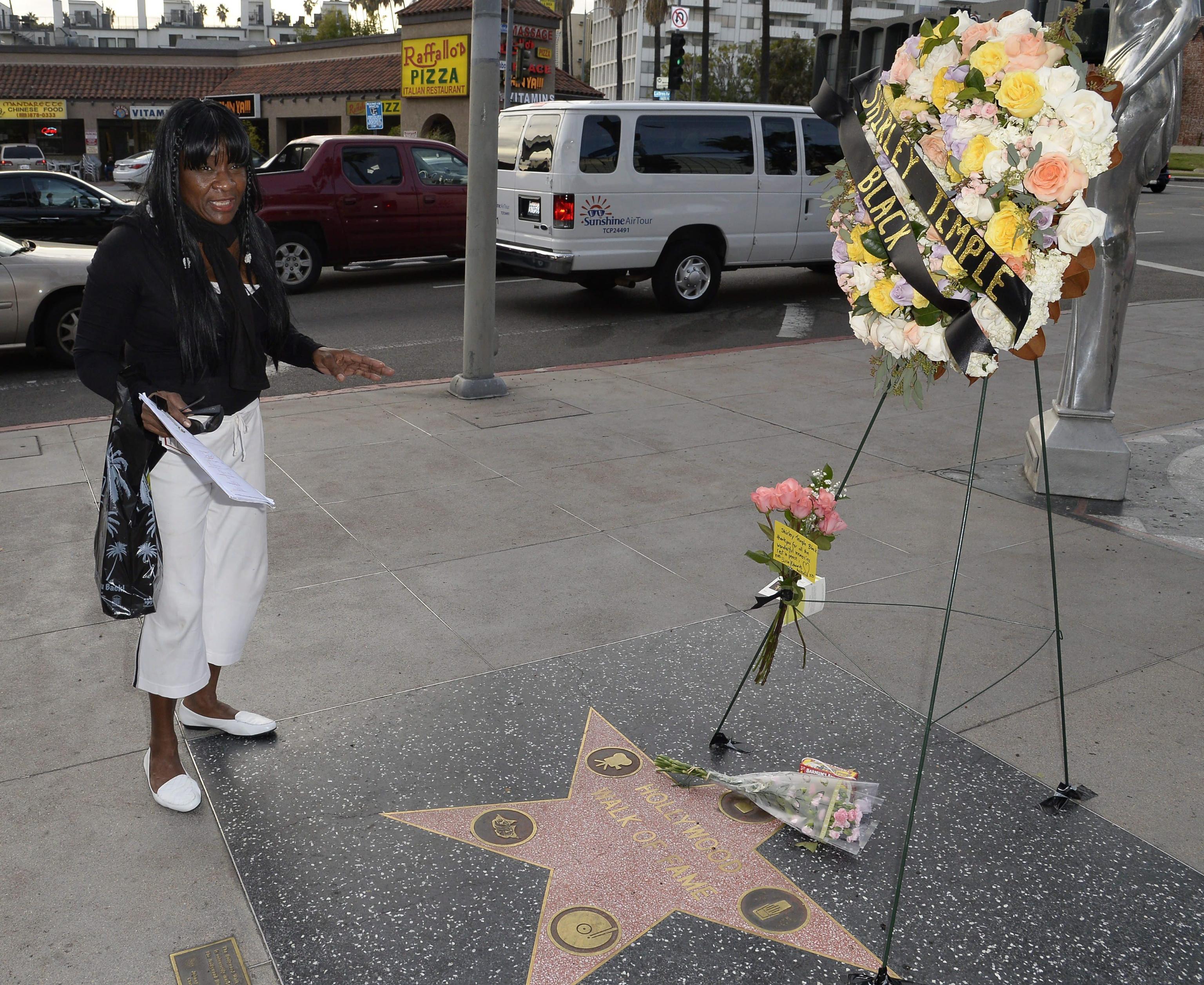 epa04070655 Lanita Avery from Washington DC sings a song from one of late child star Shirley Temple's movies at a memorial set up for the actress and diplomat on the Hollywood Walk of Fame in Hollywood, California, USA, 11 February 2014. The US actress and diplomat Shirley Temple Black died in San Francisco on 10 February 2014 at the age of 85.