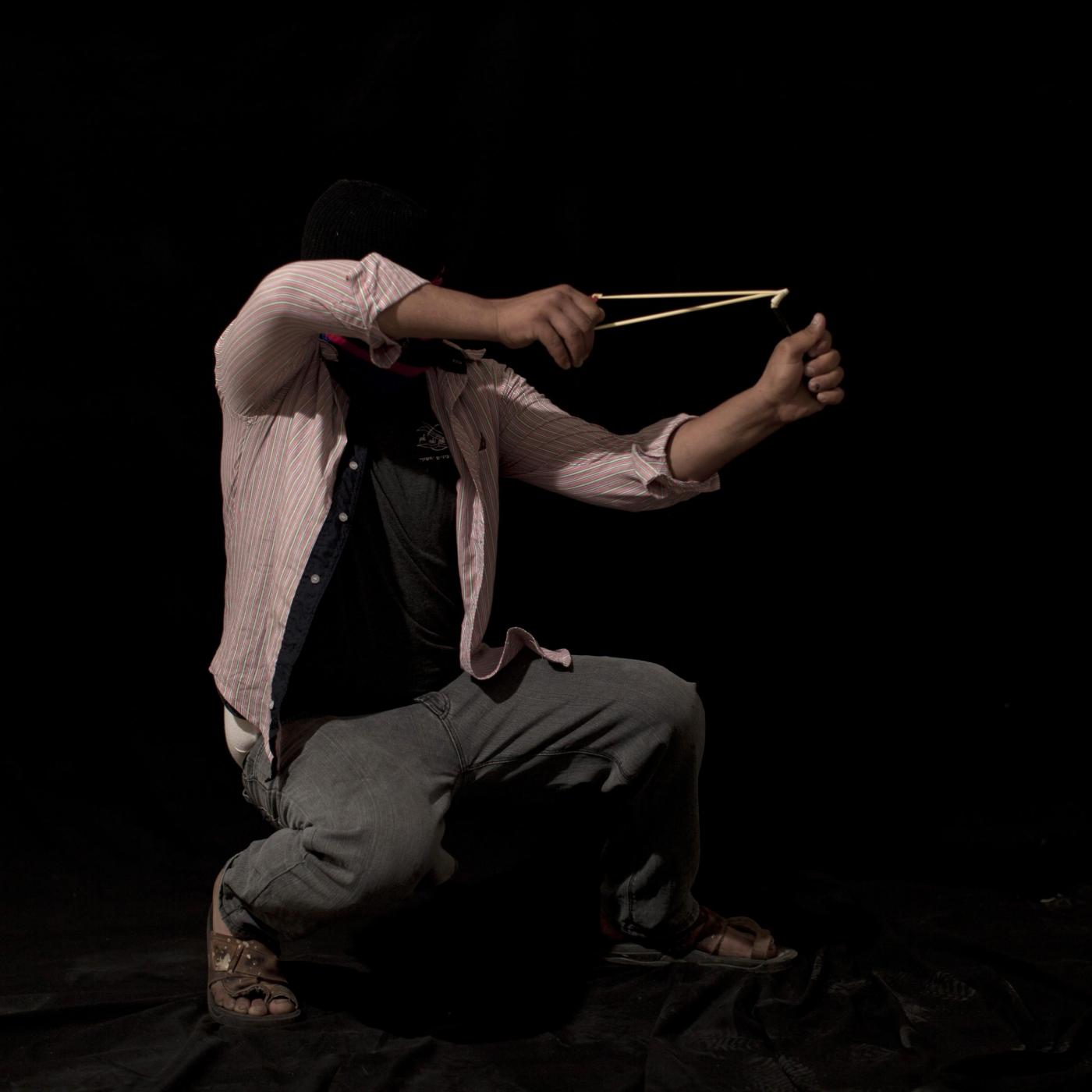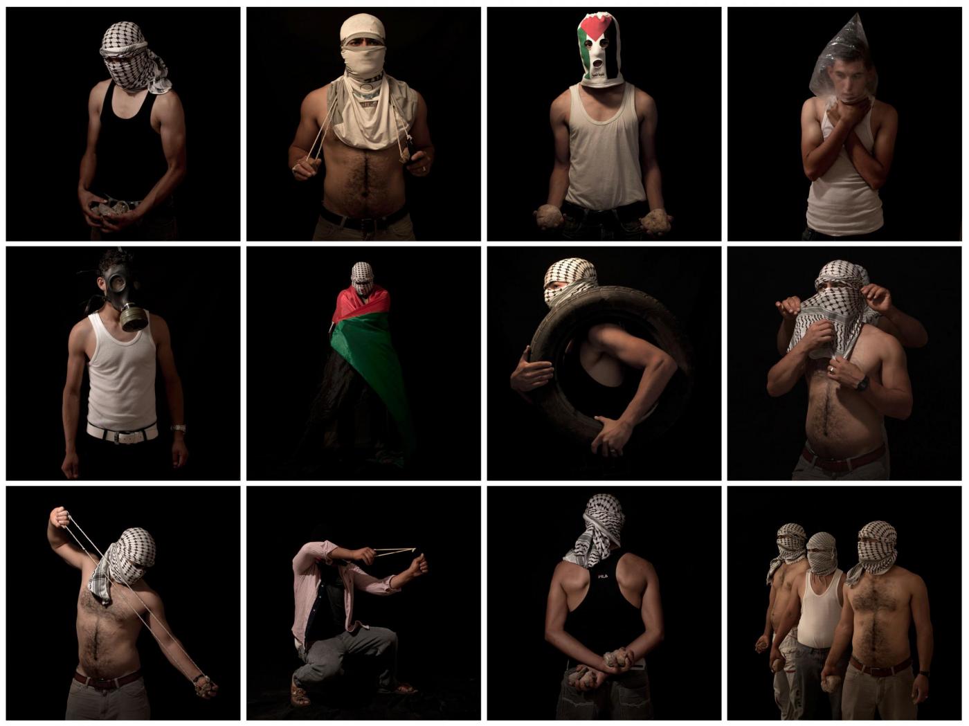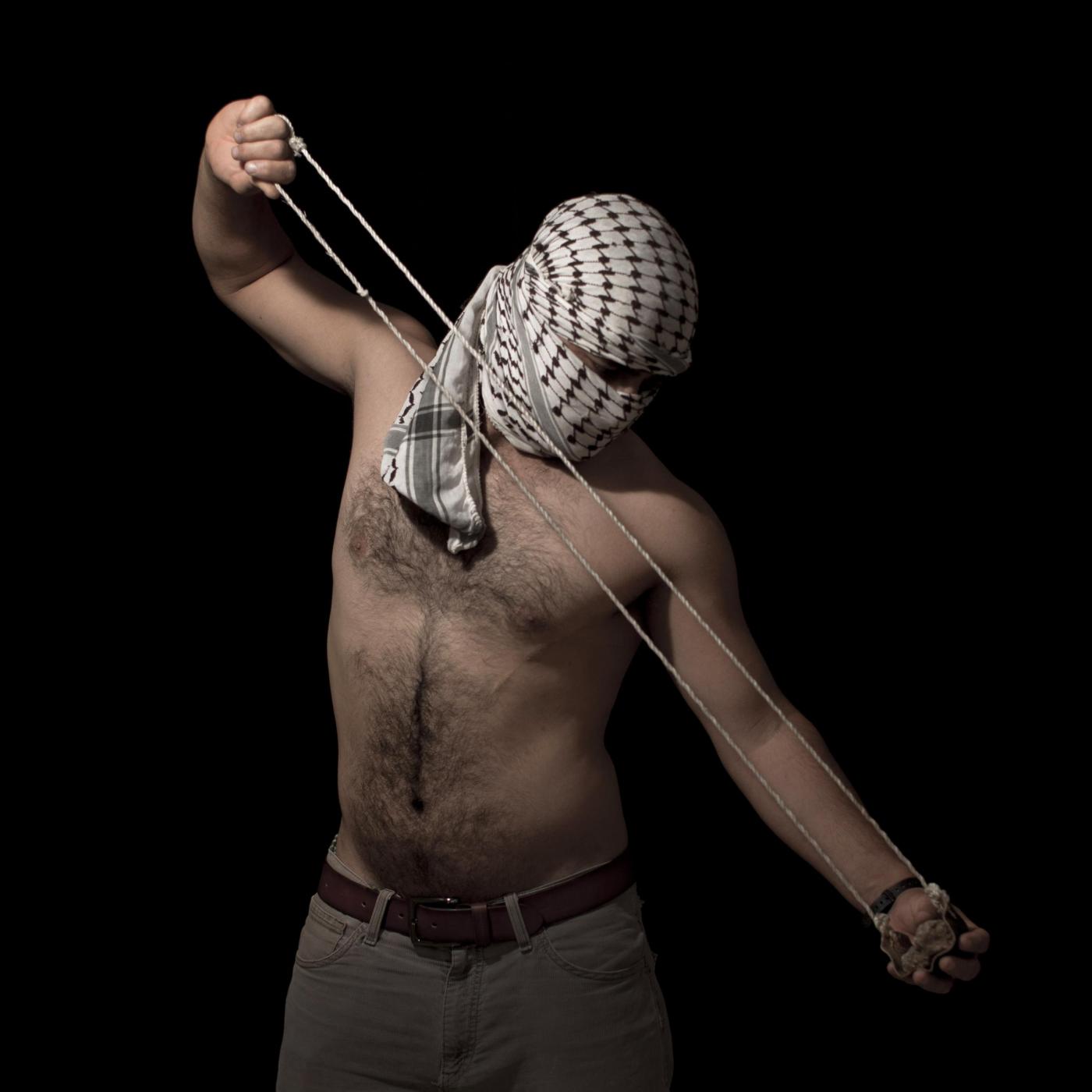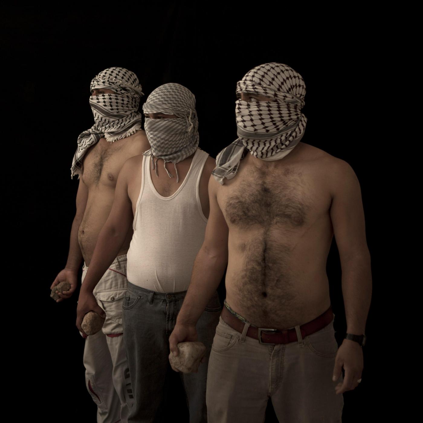 RAMALLAH (PALESTINA) – Sette giovani lanciatori di pietre originari del villaggio palestinese di Bil’in, vicino Ramallah, hanno posato con la kefia sul capo e la fionda tra le mani.