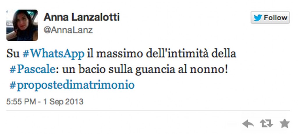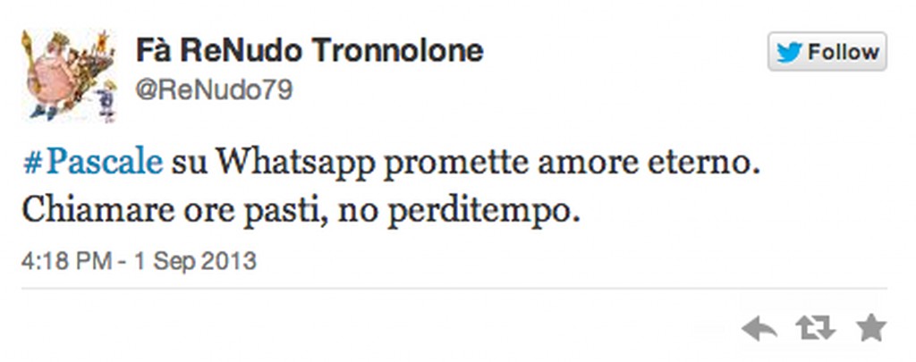 Il post ha scaturito molti commenti da parte dei fan di Selvaggia Lucarelli, e i tweet in merito si sono scatenati tra ironie e frecciatine, come quella dell’utente Vincenzio Pierri che scrive: “Francesca Pascale su Whatsapp promette amore eterno a #Berlusconi. Finché la Cassazione non ci separi” o quella di Fà ReNudo Tronnolone che commenta: “#Pascale su Whatsapp promette amore eterno. Chiamare ore pasti, no perditempo”.