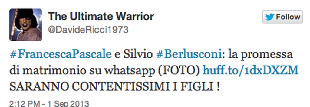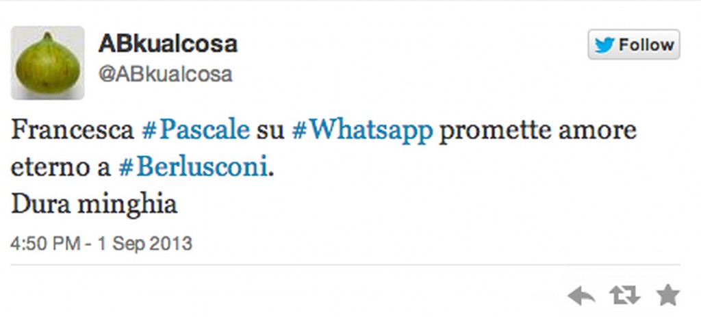 La blogger Selvaggia Lucarelli ha postato su Facebook la foto di uno stamp del presunto “Whatsapp” di Francesca Pascale (cliccare qui per vedere lo stamp) in cui sembra che giuri amore folle ed eterno all’ex premier.