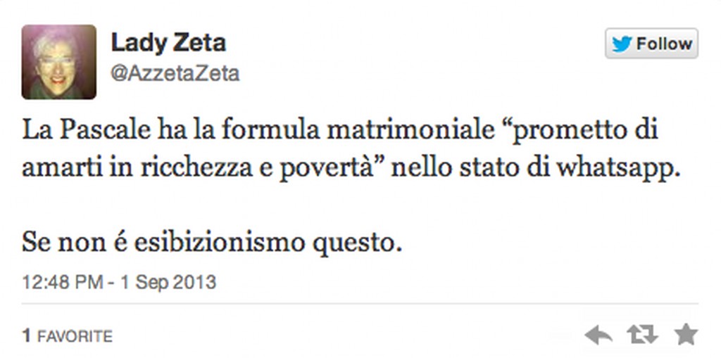 “Mi cade l’occhio sul profilo whatsapp della Pascale e scopro che ha fatto la promessa di matrimonio a Silvio. Deve essere proprio amore vero per essere disposta a correre quel rischio così concreto di amarlo anche in povertà”.