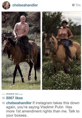 La campagna è tornata alla ribalta dopo che Instagram ha rimosso una foto dell’attrice e presentatrice tv Chelsea Handler come era già accaduto a Madonna. La Handler ha però deciso di intraprendere una reazione molto più diretta rispetto alla cantante ed ha deciso di postare più volte la sua foto accanto a quella di Putin a torso nudo e si è cancellata da Instagram quando è stata rimossa per l’ennesima volta.