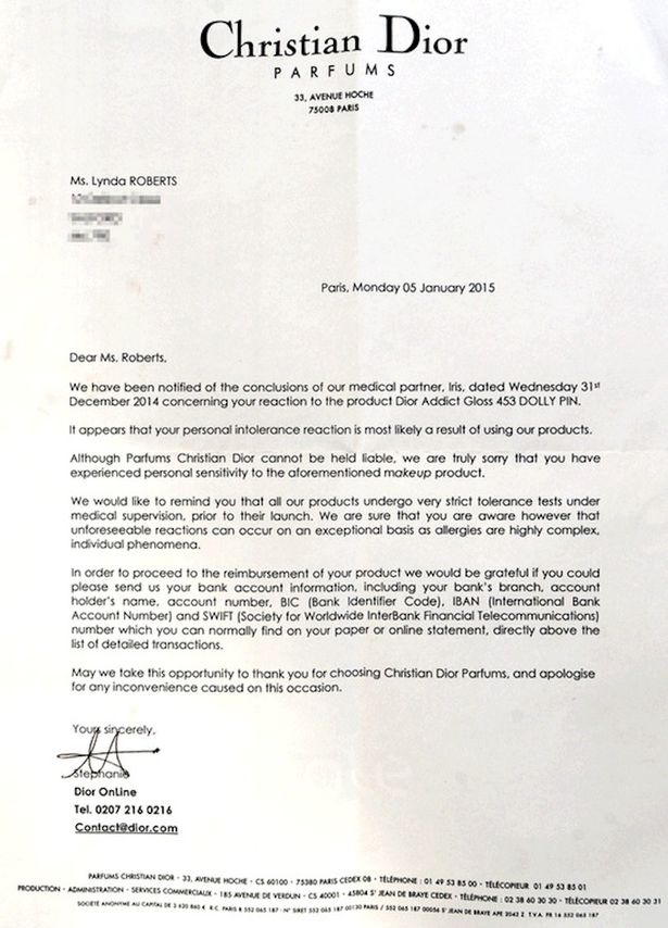 Dopo aver messo il Dolly Pin, la donna ha iniziato a sentire un formicolio, poi ha sentito dolore e ha iniziato a vedere delle piaghe comparire sulle labbra. “Non ho potuto festeggiare il mio 40esimo anniversario di matrimonio”, ha raccontato al Mirror, “mi sentivo un mostro e non volevo uscire di casa”. Dior ha mandato una lettera di scuse alla donna e un piccolo omaggio per farsi perdonare della mancanza di informazione che ha causato un danno tanto grave spiegando che le reazioni accadute alla donna sono rari ma non per questo poco gravi. Oltre al piccolo omaggio e alle lettere di scuse Dior ha donato su richiesta della donna il rimborso economico pattuito in beneficenza.