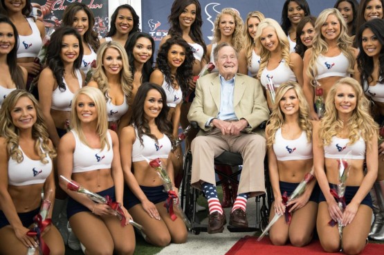 In this photo taken Wednesday, April 17, 2013, former President George H.W. Bush poses for a group photo with the newly-announced Houston Texans cheerleaders during a ceremony introducing the new squad at the team's NFL football training facility in Houston. (AP Photo/Houston Chronicle, Smiley N. Pool) MANDATORY CREDIT