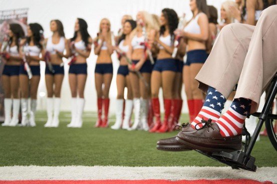 Bush padre, sulla sedia a rotelle per l’età avanzata e perché malato da tempo, indossa dei calzini patriottici che raffigurano la bandiera americana a stelle e strisce.