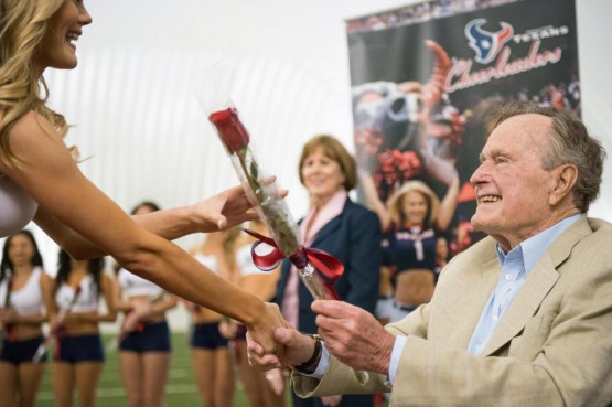 In this photo taken Wednesday, April 17, 2013, former President George H.W. Bush presents a rose to a new Houston Texans cheerleader during a ceremony introducing the new squad at the team's NFL football training facility in Houston. (AP Photo/Houston Chronicle, Smiley N. Pool) MANDATORY CREDIT