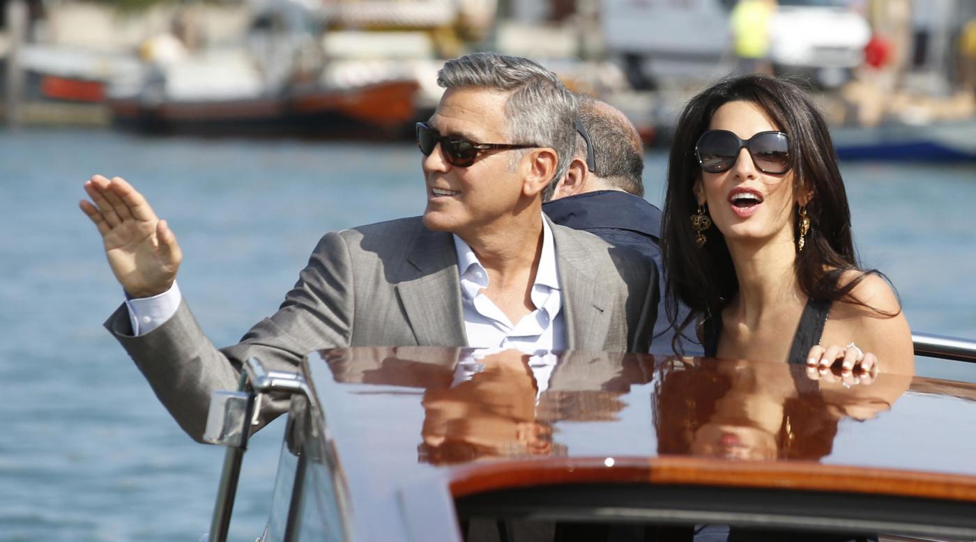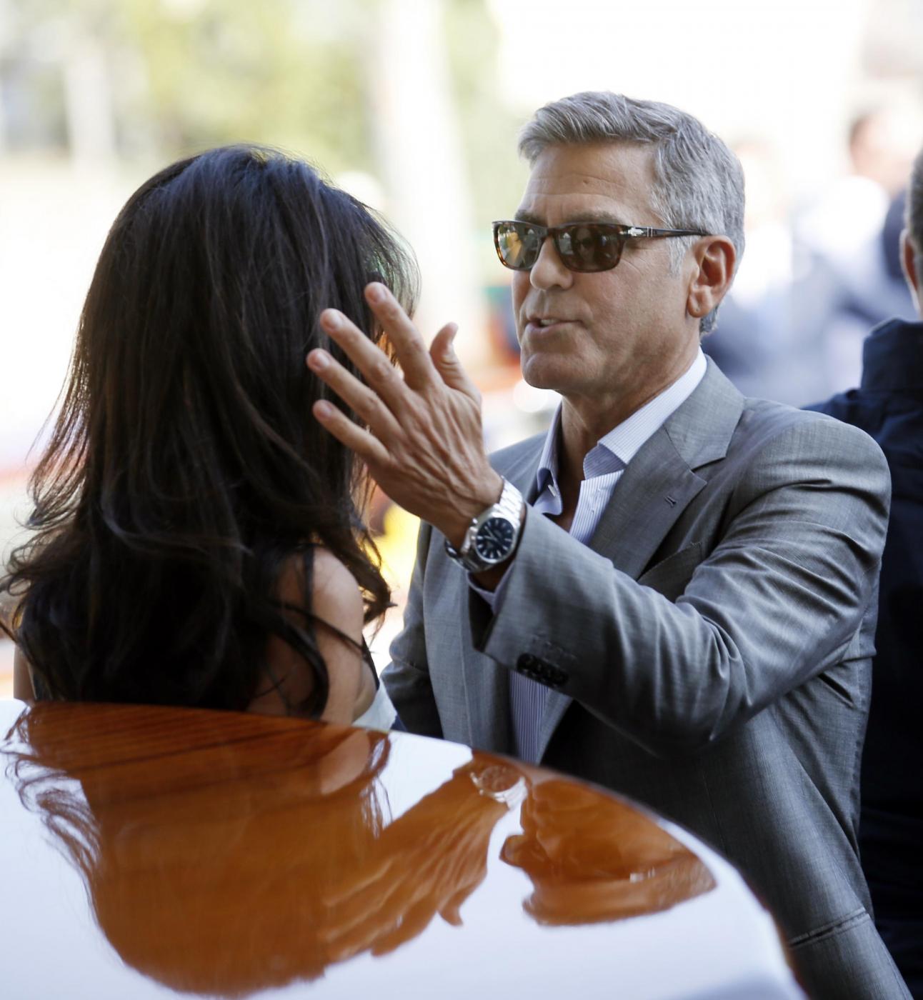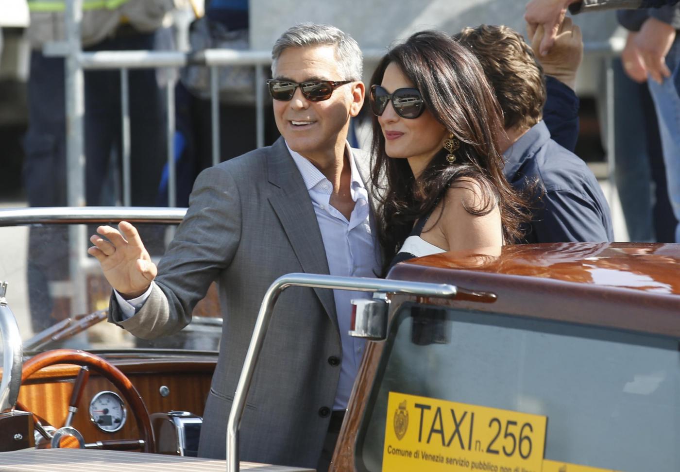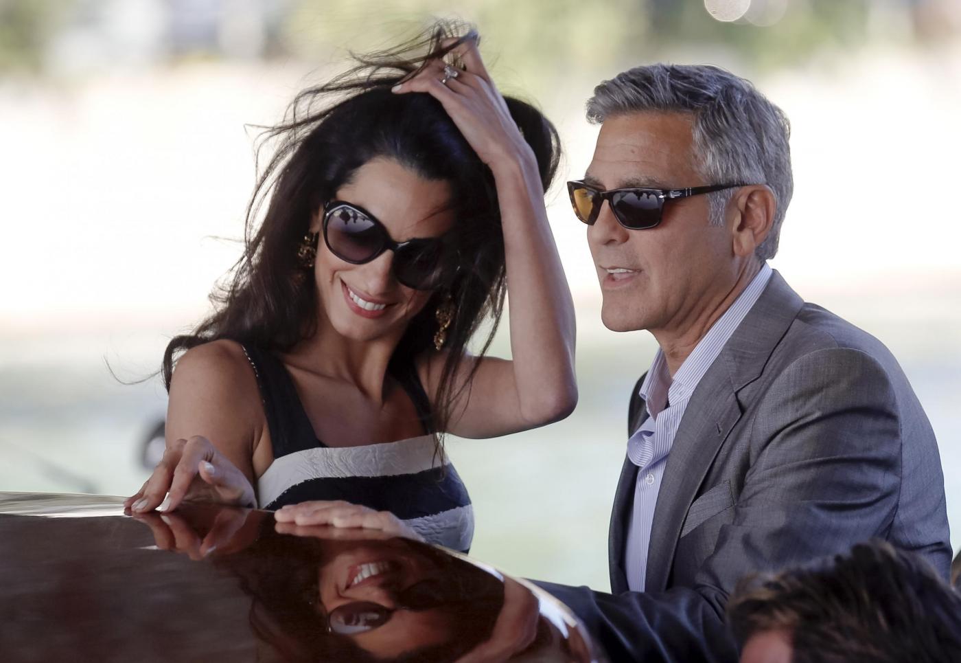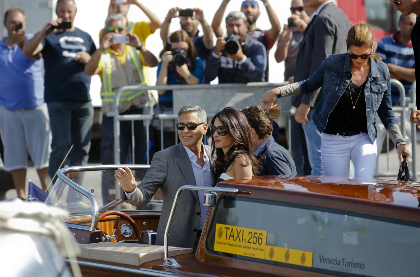 George indossava una giacca chiara e occhiali scuri, Amal un vestito a righe bianco e nero e capelli sciolti al vento. Ad attenderli davanti l’hotel Cipriani, dove alloggeranno gli ospiti che stanno arrivando in Laguna, una piccola folla di fan e fotografi. Entrambi sono apparsi più raggianti e felici che mai.