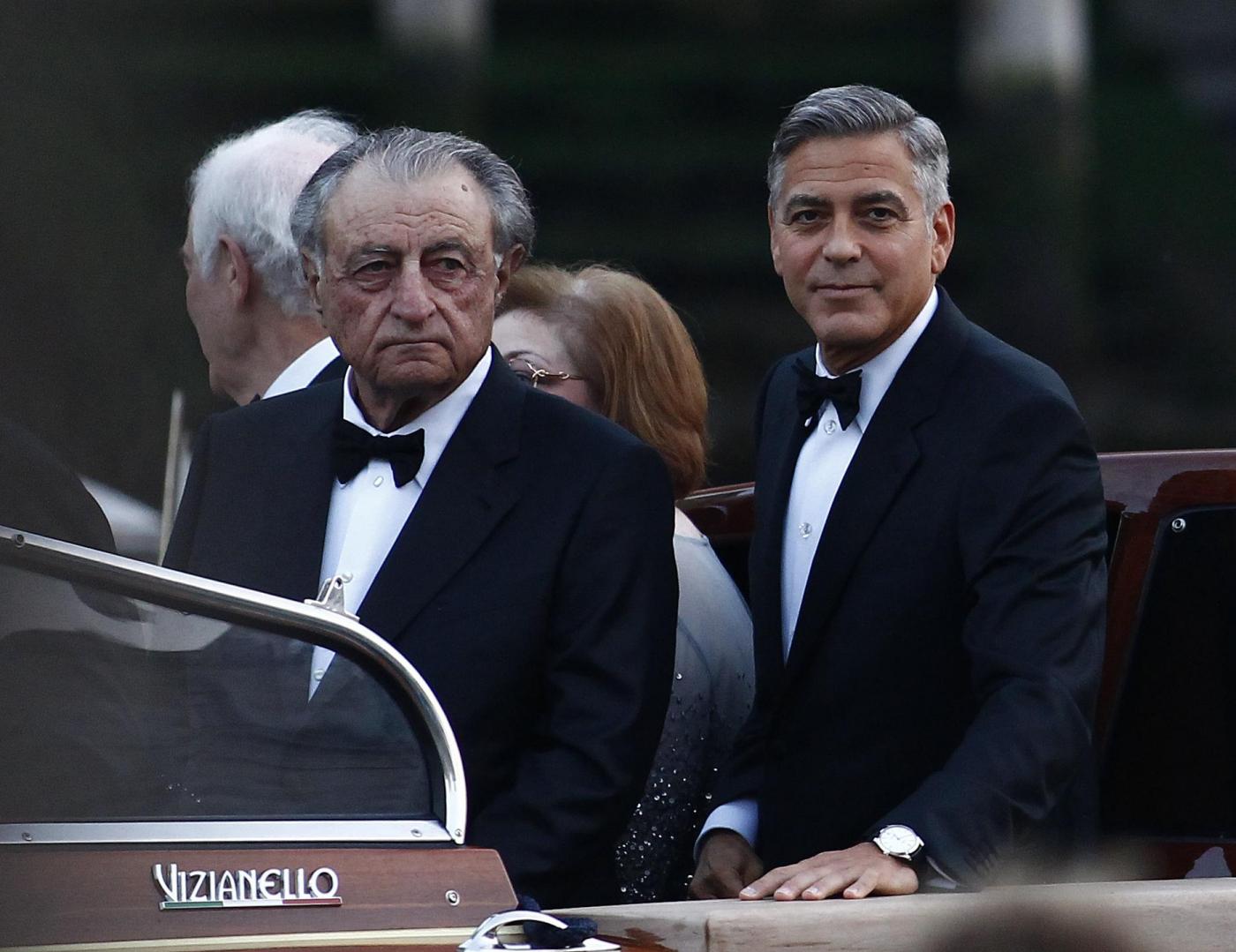 Actor George Clooney, right, flanked by Ramzi Alamuddin, father of her fiancee Amal Alamuddin, waves from a boat carrying them to the Aman hotel ahead of his wedding in Venice, Italy, Saturday, Sept. 27, 2014. (AP Photo/Luca Bruno)