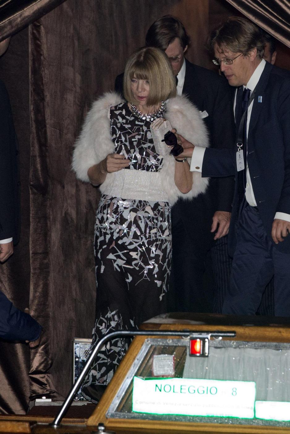Vogue America chief-editor Anna Wintur leaves the Aman hotel where George Clooney married human rights lawyer Amal Alamuddin in Venice, Italy, Sunday, Sept. 28, 2014. (AP Photo/Andrew Medichini)