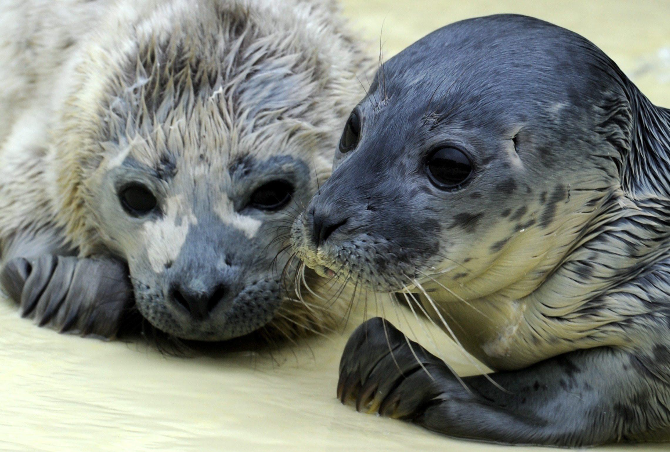 epa03720106 The two seal puppies 'Angie M.' (R) and 'Peer S.' lie in an area of the seal station in Friedrichskoog, Germany, 27 May 2013. The two pups were found at the north beach of Helgoland on 20 May 2013. EPA/CARSTEN REHDER