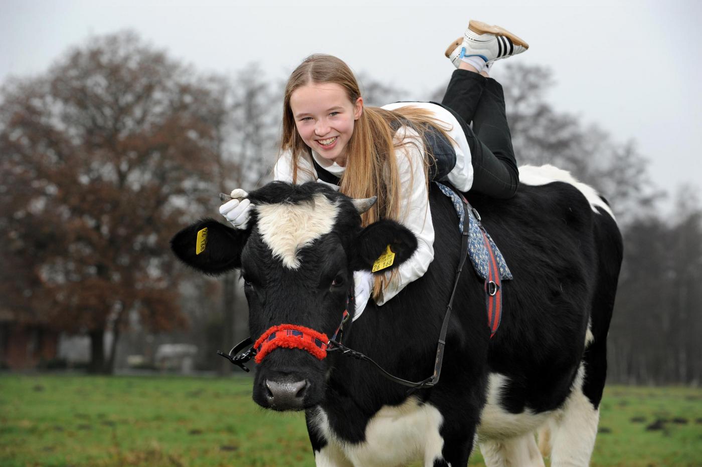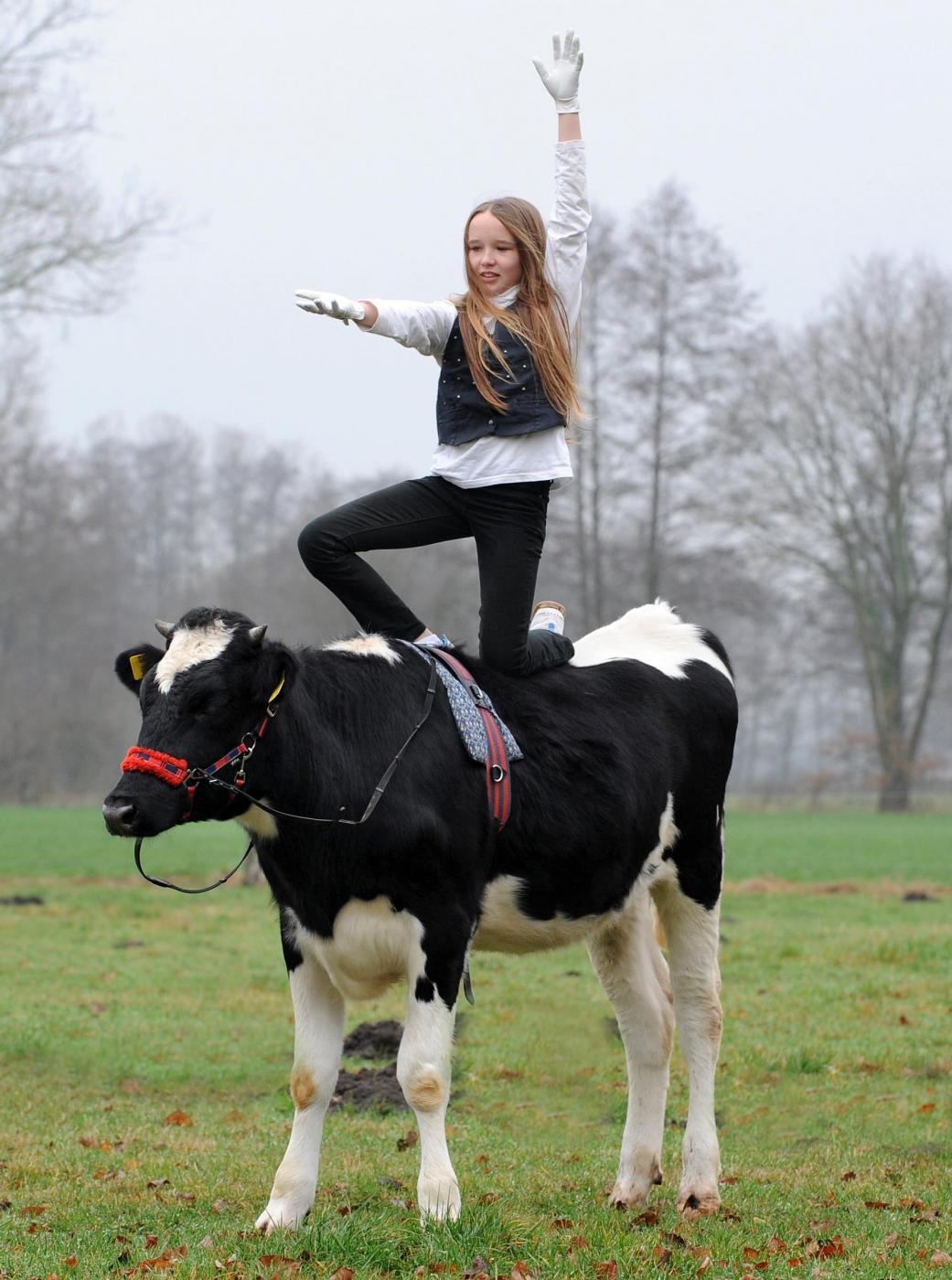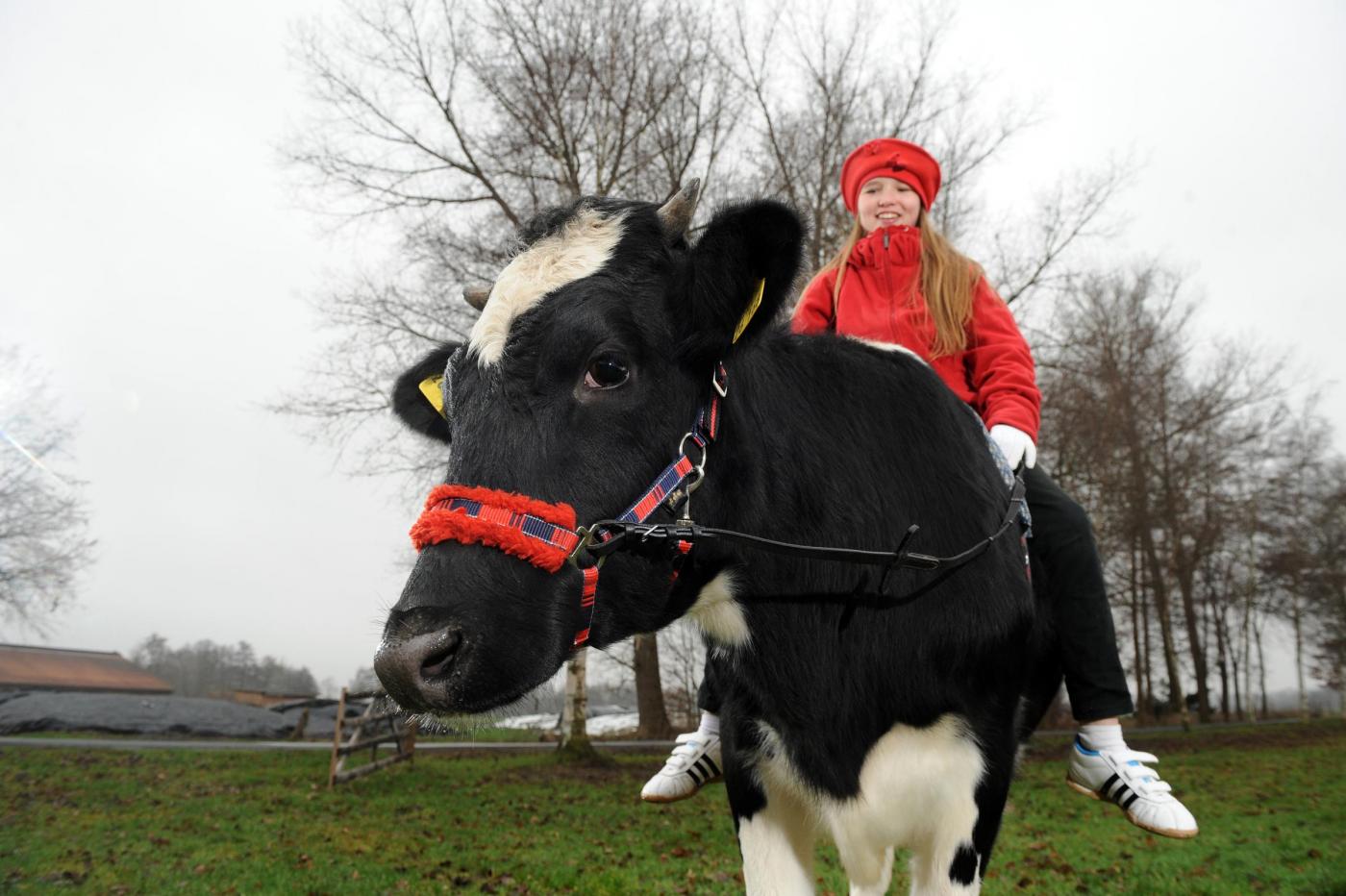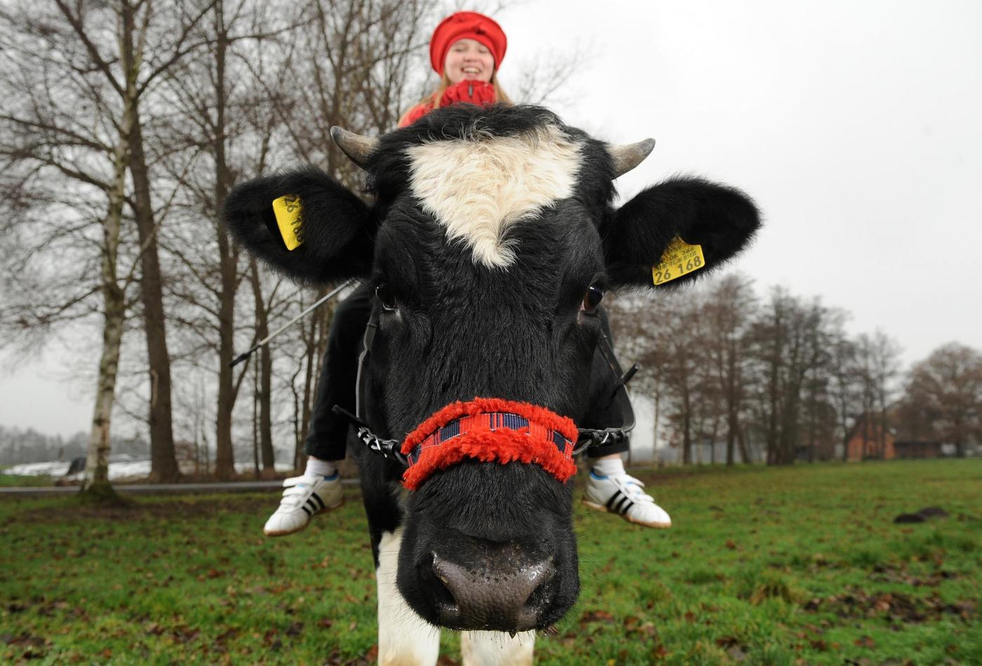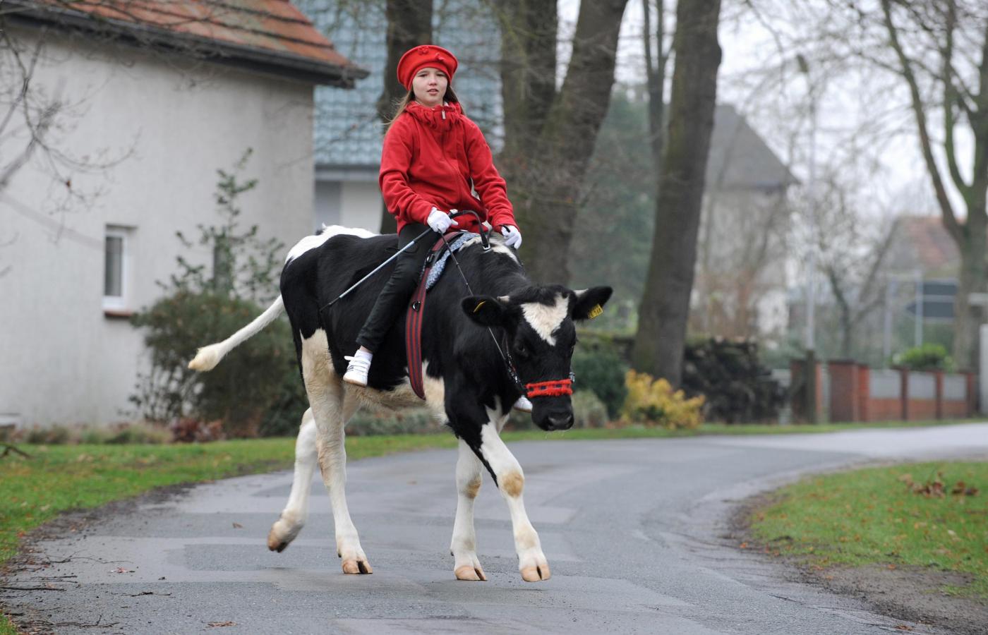 Iris sognava di avere un cavallo e non è riuscita ad averlo. Dopo però la nascita di Jutta, alla ragazza è venuta un’idea: perché non cavalcare una mucca? Così, dopo essersi esercitata per 14 mesi, ora Iris è in grado di cavalcare Jutta come se fosse un cavallo (foto Ap/LaPresse)