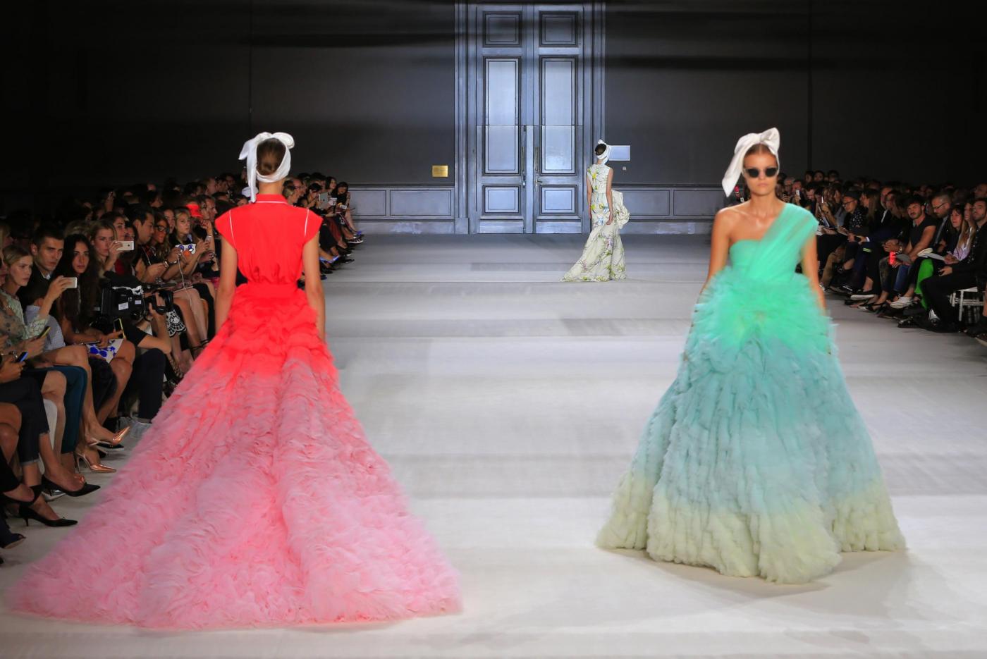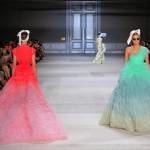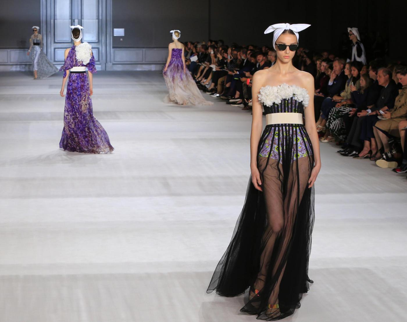 Models wear creations by Italian-born fashion designer Giambattista Valli, as part of his Fall Winter 2014-15 Haute Couture collection, presented in Paris, Monday, July 7, 2014. (AP Photo/Jacques Brinon)