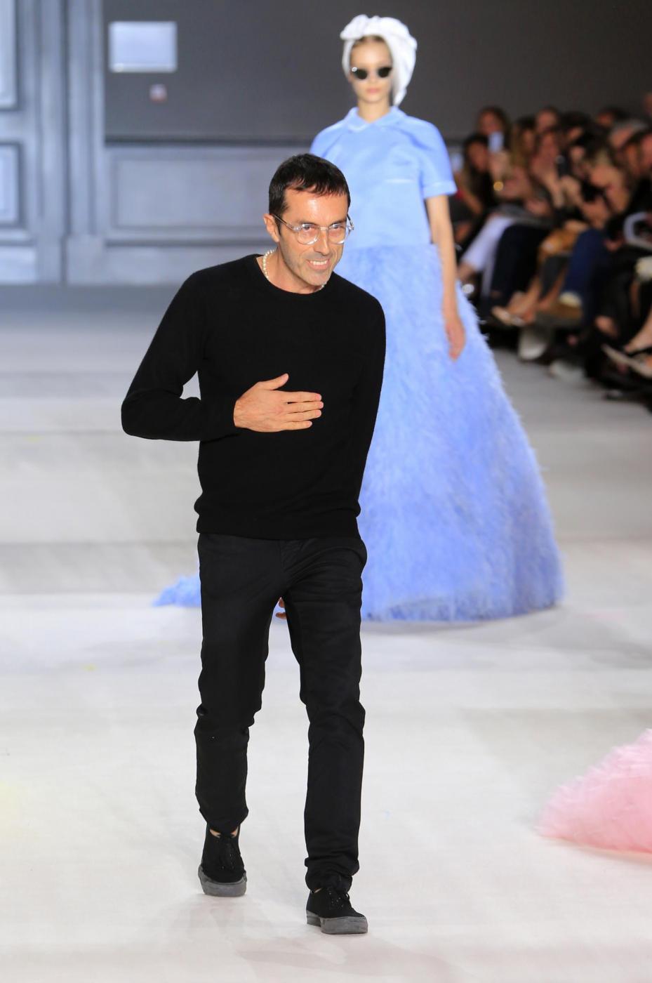 Italian-born fashion designer Giambattista Valli acknowledges applause, following the presentation of his Fall Winter 2014-15 Haute Couture collection, Monday, July 7, 2014, in Paris. (AP Photo/Jacques Brinon)