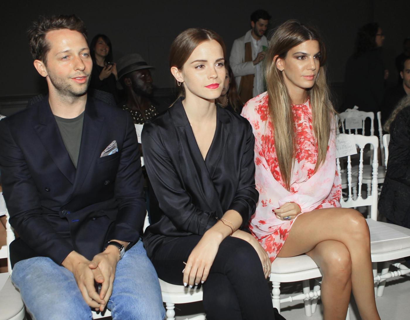 Emma Watson e Bianca Brandolini d'AddaActress Emma Watson, center, fashion writer Derek Blasberg, left, and Italian socialite Bianca Brandolini d'Adda attend the Giambattista Valli Fall Winter 2014-15 Haute Couture collection, presented in Paris, Monday, July 7, 2014. (AP Photo/Jacques Brinon)