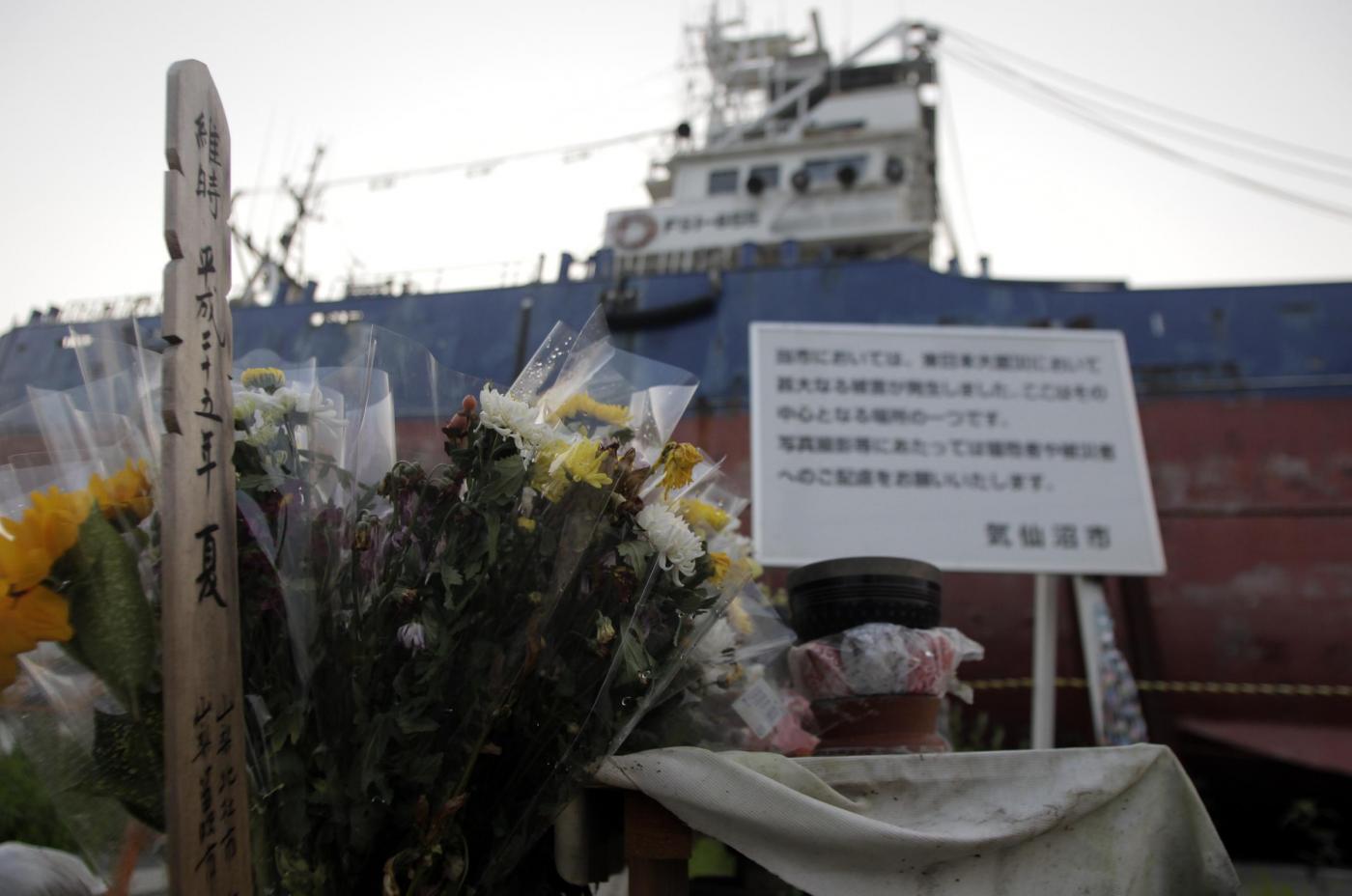 In this photo taken on Sunday Aug. 11, 2013, flowers and gifts are left by a stranded fishing boat standing in a residential district of Kesennuma, Miyagi prefecture, northern Japan. The boat, named Kyotokumaru has become a landmark, but city officials announced last week that it will be torn down. (AP Photo/Azusa Uchikura)