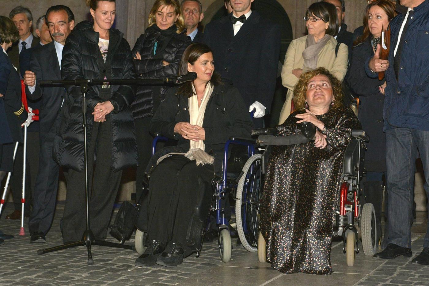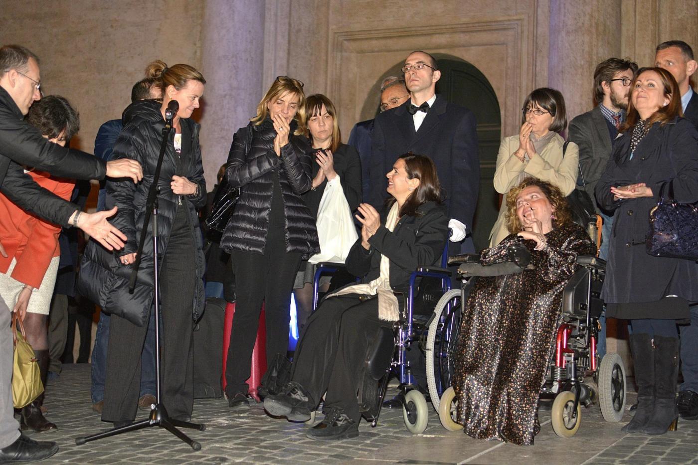Foto LaPresse Cronaca Roma 01.04.2014 La facciata di Palazzo Montecitorio illuminata in occasione della Giornata Mondiale di sensibilizzazione sull'Autismo; partecipa la presidente della Camera Laura Boldrin, il ministro della salute Beatrice Lorenzin, deputato PD Iliana Argentin. Nella foto da sinistra, Beatrice Lorenzin, Laura Boldrini, Iliana Argentin