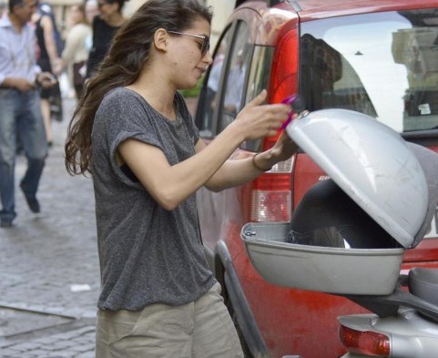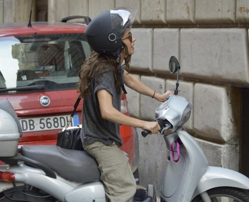 La Michelini, nota sul piccolo schermo nel ruolo di Rosy Abate in “Squadra antimafia – Palermo oggi”, accortasi dei fotografi opta per una precipitosa fuga con lo scooter (foto LaPresse)