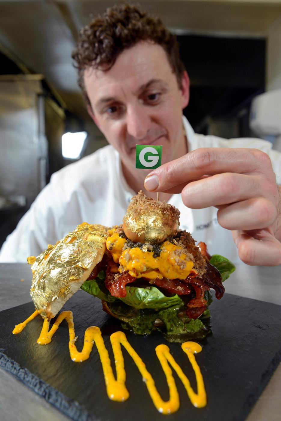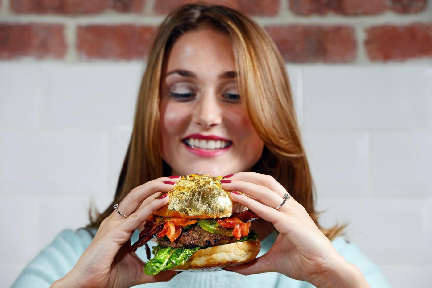 Undated handout photo issued by Groupon of the Worldճ Most Expensive Burger costing 1,100, created at Honky Tonk restaurant in Chelsea, to celebrate Grouponճ five millionth food and drink voucher being sold. PRESS ASSOCIATION Photo. Issue date: Tuesday October 7, 2014. The burger patty is made from 220 grams of Kobe Wagyu beef minced with 60 grams of New Zealand venison and a rich center of black truffle brie to create a liquid pocket once the meat has cooked. The patty is then seasoned with smoked Himalayan salt and served with a Canadian lobster poached in Iranian saffron. Atop the lobster, the chef has added maple syrup coated streaky bacon, Beluga caviar and a hickory smoked duck egg intricately covered in edible gold leaf. The bun is seasoned with a Japanese matcha and cream mayonnaise and coated in gold leaf. The finishing touches are a mango and champagne jus and grated white truffle. Photo credit should read: Groupon/PA WirePa/LaPresseOnly Italy