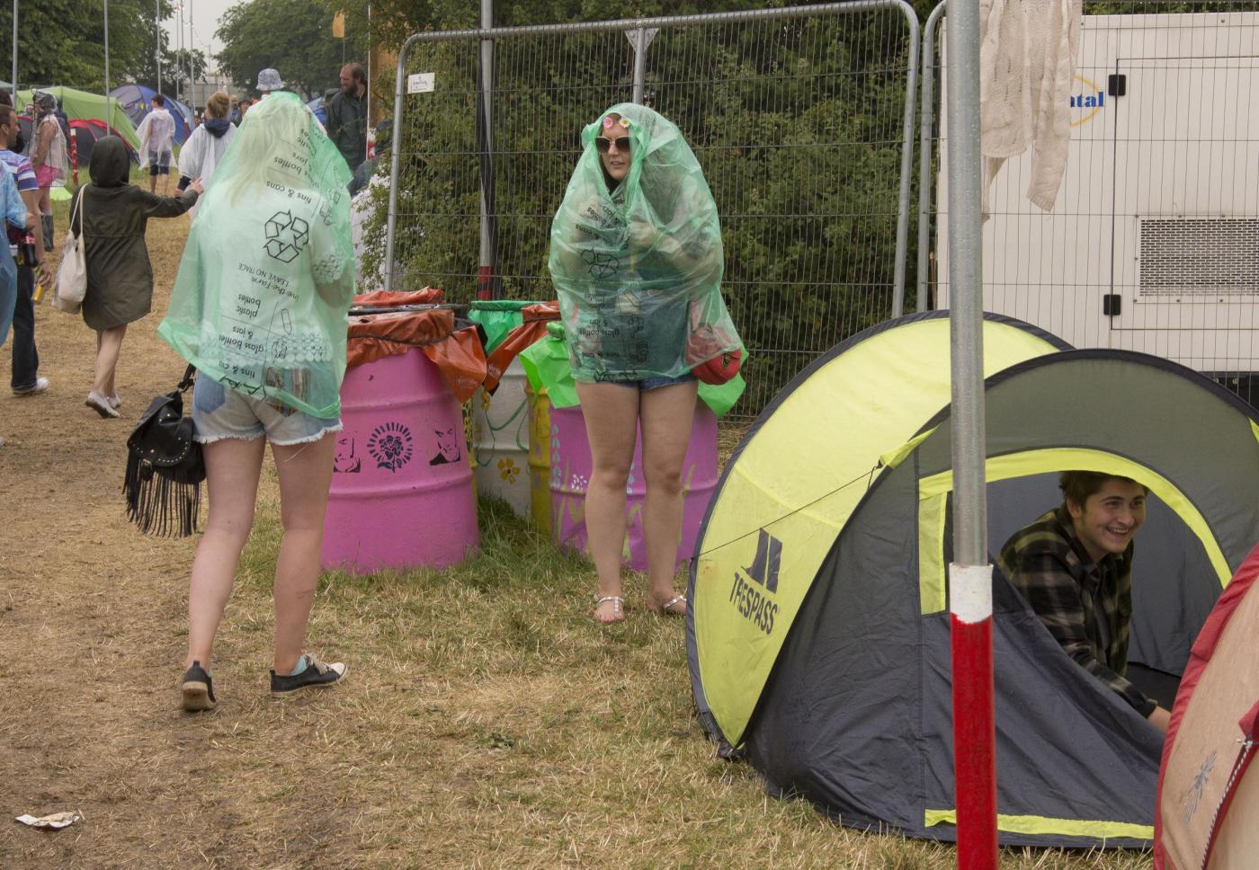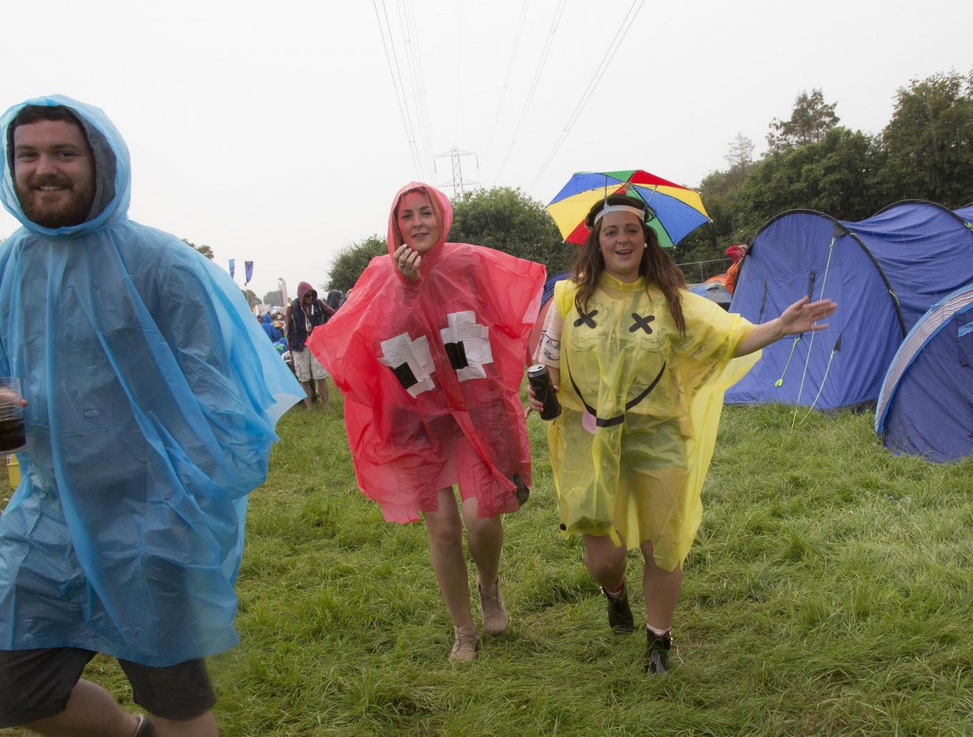 CAPTION CORRECTIONS OMITS THE NUMBER OF PEOPLE EXPECTED, CHANGING IT TO THOUSANDS Festival goers take cover from the rain at Glastonbury music festival, Thursday, June 26, 2014. Thousands are expected to arrive at Worthy Farm in Pilton over the next five days to watch hundreds of acts amongst headliners Dolly Parton Arcade Fire, Metallica and Kasabian.(Photo by Joel Ryan/Invision/AP)