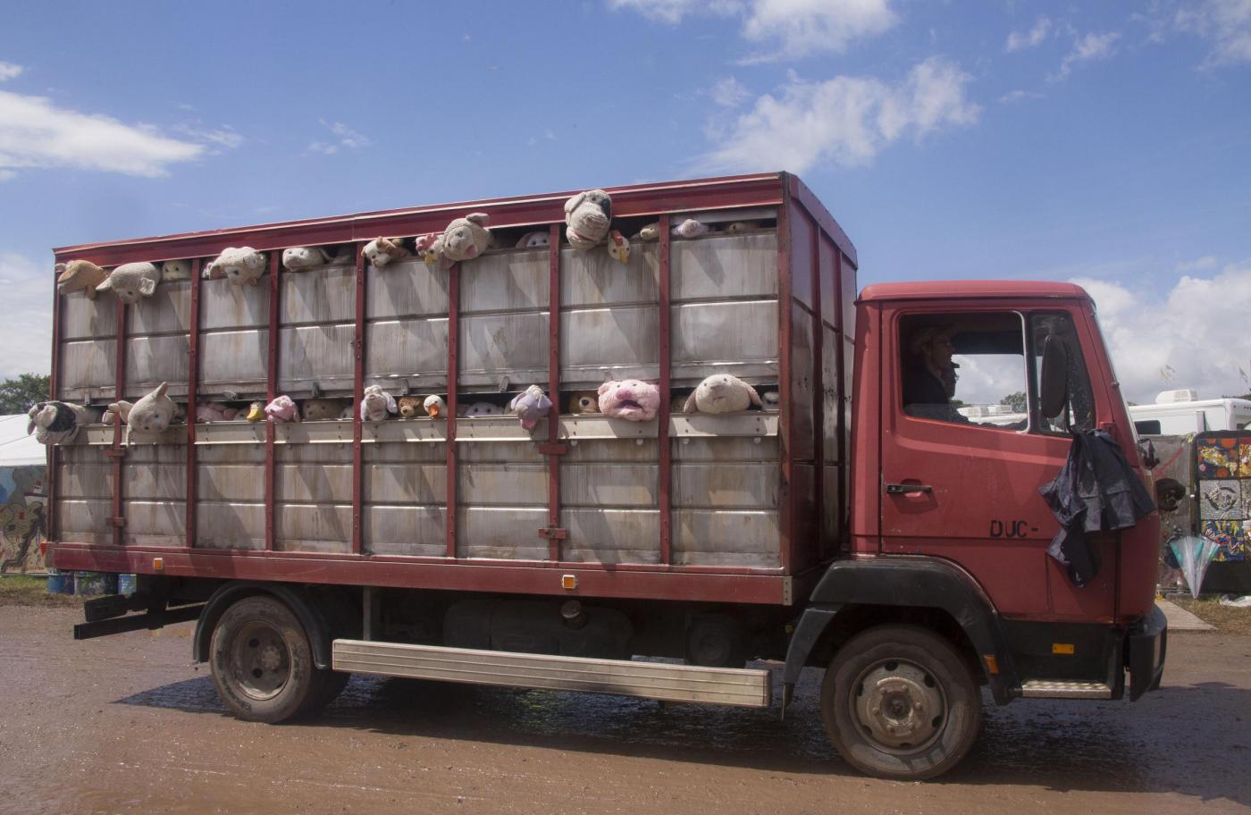 L'opera di BanksyA slaughter truck stuffed with farmyard puppets entitled 'Sirens Of The Lambs', is driven through Worthy Farm in Pilton, during Glastonbury music festival, England, Saturday, June 28, 2014, and is a moving sculpture by graffiti artist Banksy, which is designed to highlight the issue of animals being farmed for their meat. (Photo by Joel Ryan/Invision/AP)