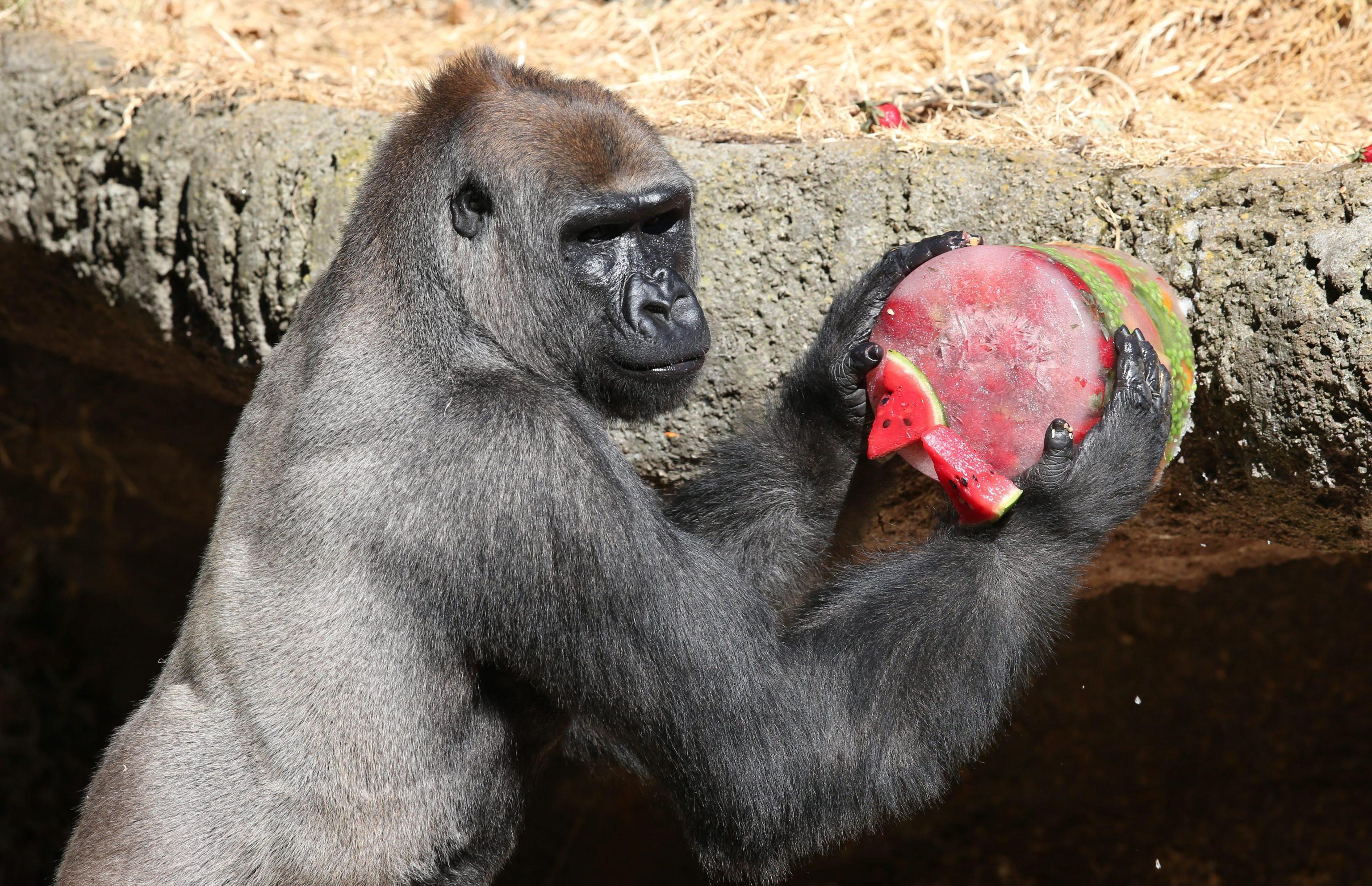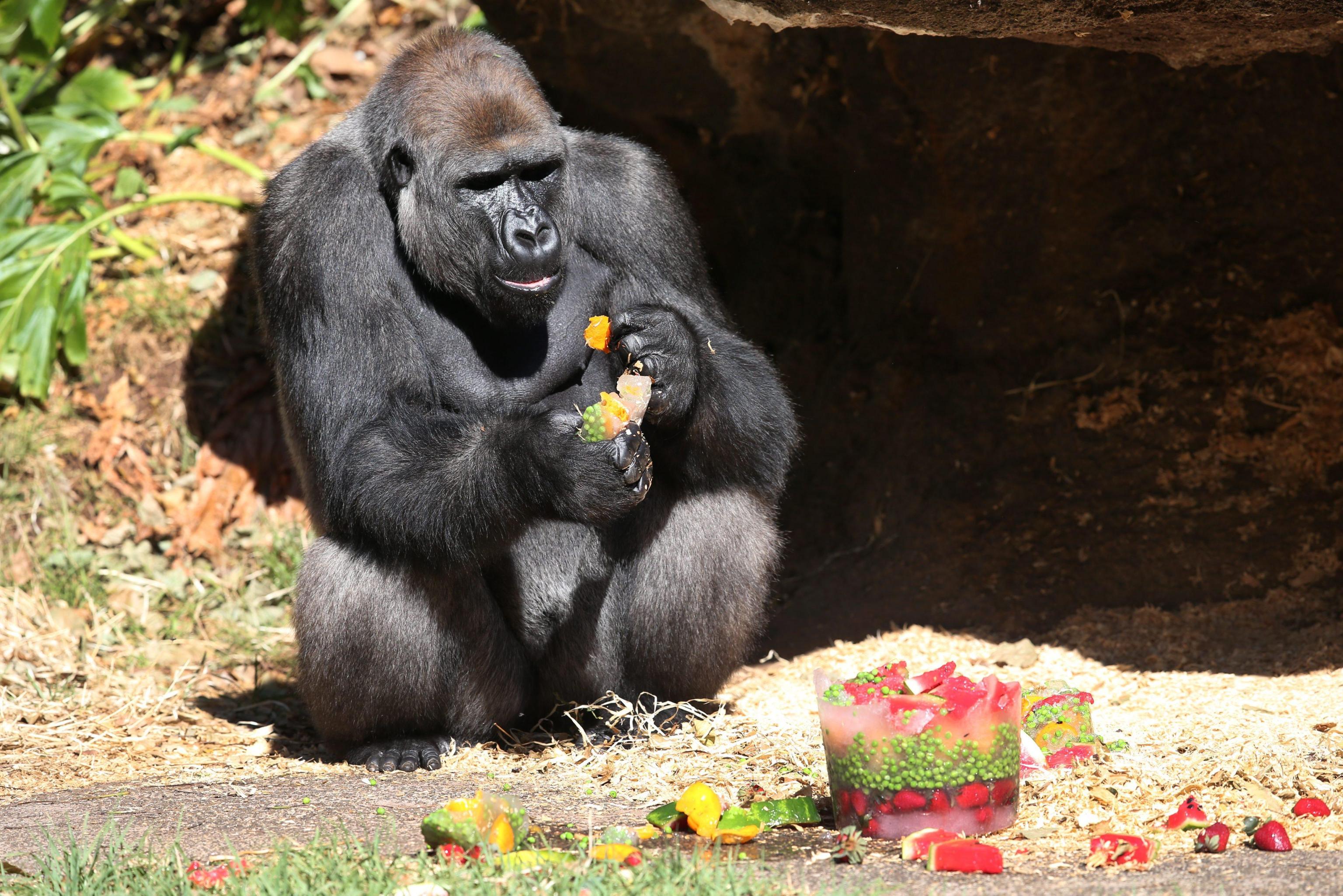 Otana festeggia il compleanno gustandosi la frutta ghiacciata che gli inservienti dello zoo gli hanno servito. Il gorilla proviene da un giardino zoologico dell’Inghilterra ed è stato donato allo zoo australiano per un un programma di ripopolamento (foto Ansa)