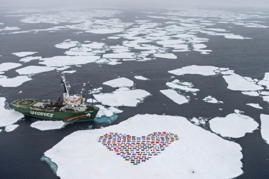 OCEANO ARTICO – Un cuore fatto di 193 bandiere che rappresentano i Paesi membri delle Nazione Unite è comparso sui ghiacci del circolo polare artico. A costruirlo, l’equipaggio della nave di Greenpeace, Arctic Sunrise. Il “cuore” simboleggia un appello che l’associazione ambientalista rivolge ai Paesi di tutto il mondo per un’azione comune in difesa dell’Artico.