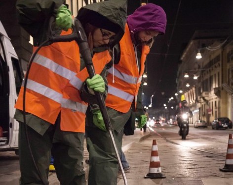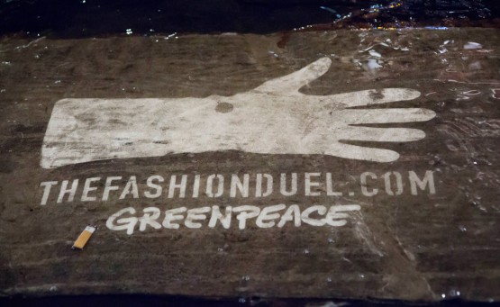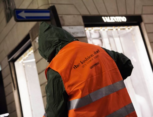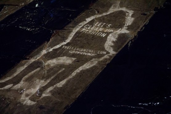 Nel corso della notte tra il 18 e il 19 febbraio, una squadra di attivisti di Greenpeace ha costellato i marciapiedi del quadrilatero della moda con le immagini della campagna “The Fashion Duel” e il messaggio “Let’s clean up fashion”, chiedi alla moda di ripulirsi, utilizzando la tecnica dei “clean graffiti” che, rimuovendo lo sporco dalle superfici, crea immagini e messaggi temporanei su strade e marciapiedi.