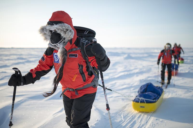 En route to the North Pole. Kiera Kolsen from Canada, an Arctic ambassador with the Team Aurora keeps pace on the trek with Greenpeace. Greenpeace is on a mission to protect the Arctic carrying a specially designed time capsule that contains a 2.7 million signature declaration demanding that the Arctic be designated an internationally-recognised global sanctuary.