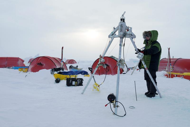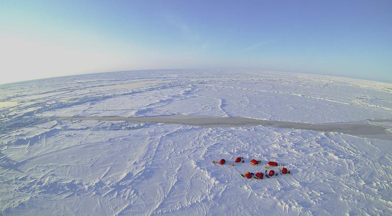 Aerial view of Greenpeace encampment in the high Arctic. The team is on a to trek to the North Pole, carrying with them a time capsule containing 2.7 million names of supporters who wish to protect the Arctic. They plan to lower the capsule and a flag for the future to the seabed beneath the North Pole.