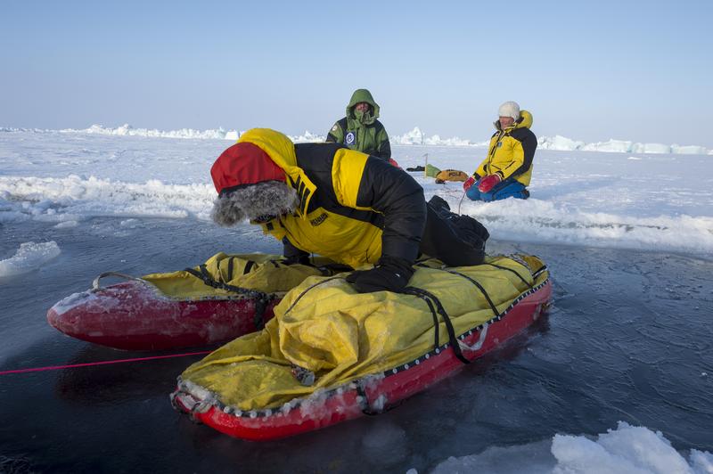 Renny Bijoux (from the Seychelles), an Arctic ambassador with Team Aurora, crosses an open lead (sea ice fracture). Greenpeace on a mission to protect the Arctic is carrying a specially designed time capsule that contains a 2.7 million signature declaration demanding that the Arctic be designated an internationally-recognised global sanctuary.