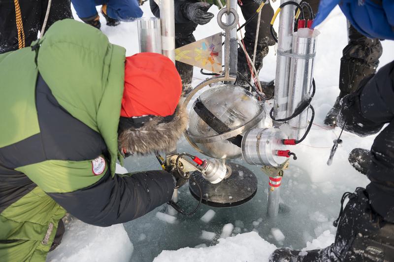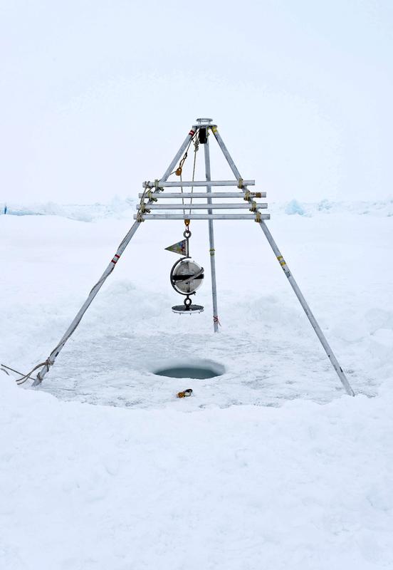 14th April 2013 - North Pole, Arctic - A Greenpeace team prepare a crane to hoist a time capsule to the seabed at the North Pole. A flag is attached to a glass and titanium time capsule containing the signatures of nearly three million people, including actors, musicians, artists and business leaders is planted on the seabed beneath the North Pole. Greenpeace is calling for the region, currently under threat from climate change, oil companies, industrial fishing and shipping to be declared a global sanctuary and free from exploitation.