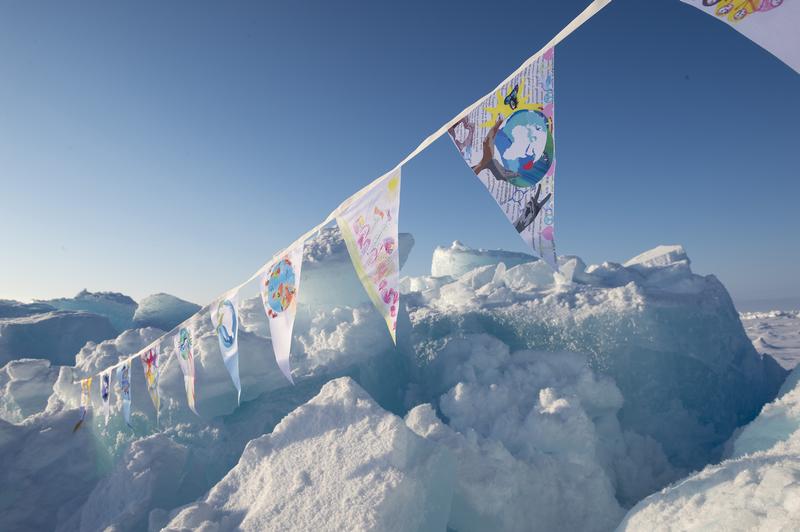 13th April 2013 -Flags for the future decorate the ice at the North Pole. A flag is attached to a glass and titanium time capsule containing the signatures of nearly three million people, including actors, musicians, artists and business leaders is planted on the seabed beneath the North Pole. Greenpeace is calling for the region, currently under threat from climate change, oil companies, industrial fishing and shipping to be declared a global sanctuary and free from exploitation.