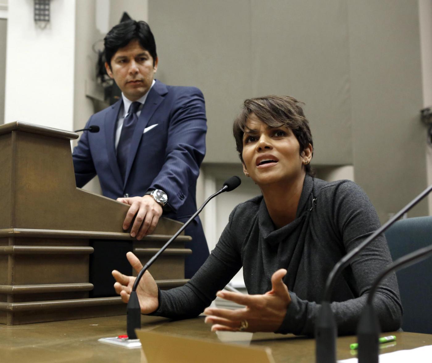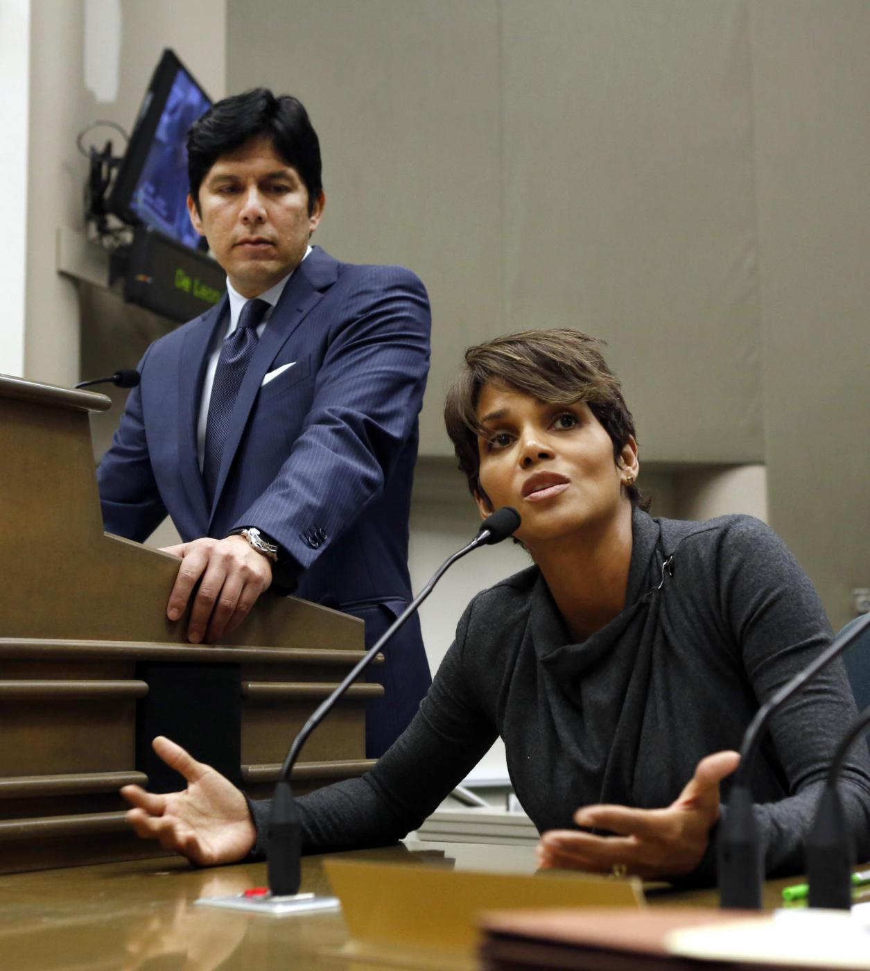 Actress Halle Berry told lawmakers that the constant presence of photographers have made her daughter scared to go to school, while testifying before the Assembly Judiciary Committee in support of a bill that would limit the ability of paparazzi to photograph children of celebrities and public figures, Tuesday, Aug. 13, 2013 at the Capitol in Sacramento, Calif. Berry and actress Jennifer Garner urged lawmakers to approve SB606, by State Sen. Kevin de Leon, D-Los Angeles, left, that would change the definition of harassment to include photographing a child without the permission of a legal guardian. (AP Photo/Rich Pedroncelli)