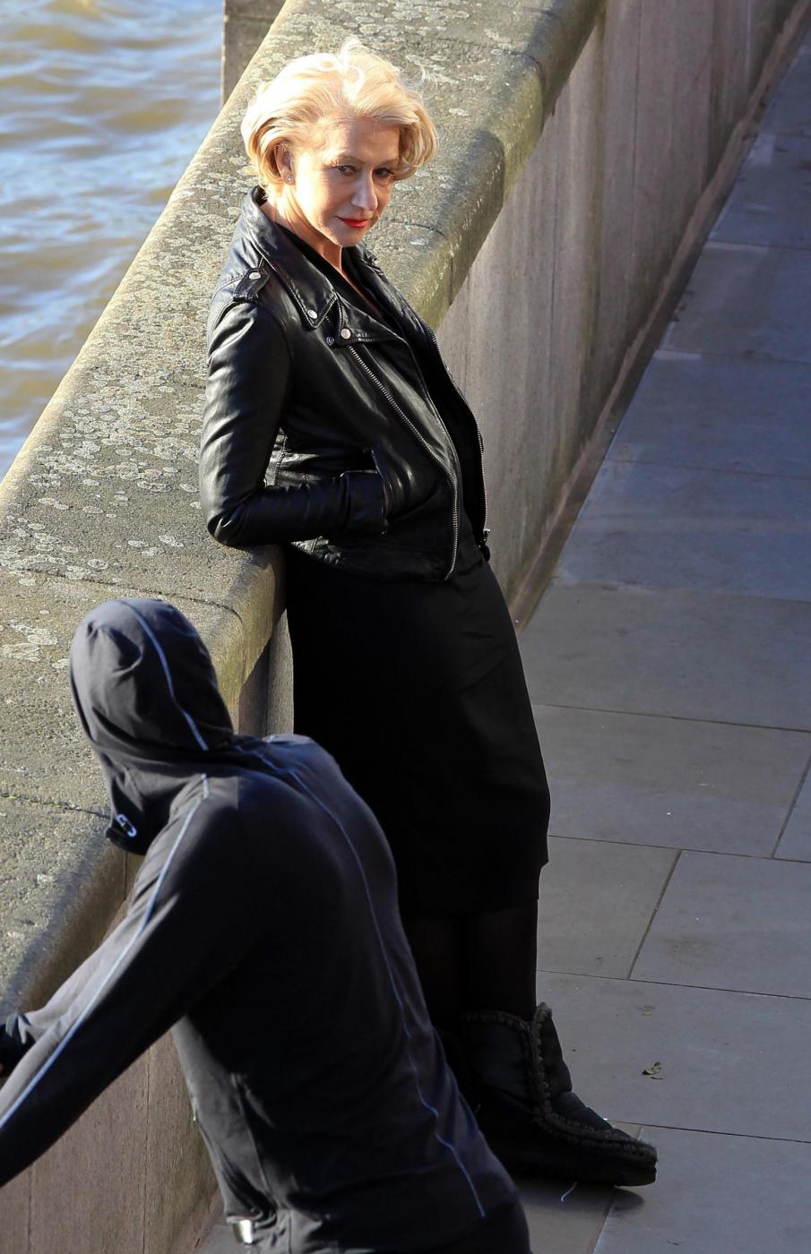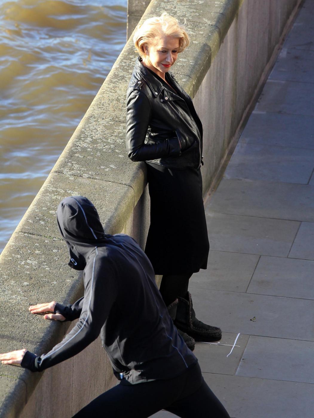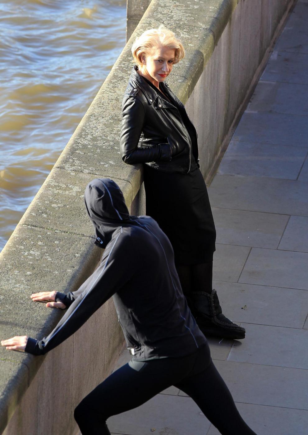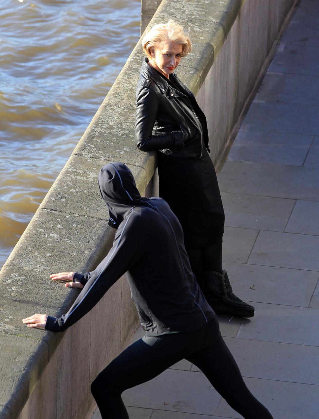 Picture Shows: Helen MirrenDecember 06, 2014Helen Mirren is seen filming a L'Oreal advert on the banks of London's River Thames in London, England.Looking sexy in a black dress and leather jacket; the sixty-nine year old British actress was seen stopping to admire a young male jogger.FameFlynet UK/LaPresseOnly Italy