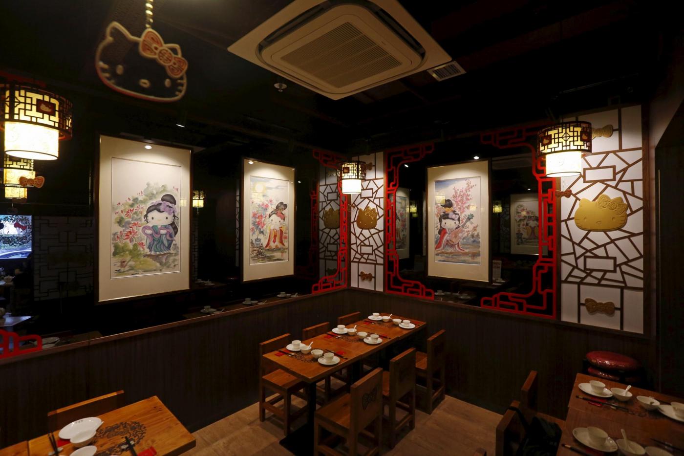 A Chinese restaurant with Hello Kitty-themed decorations is seen in Hong Kong, China May 21, 2015. The world's first Chinese-style restaurant dedicated to the Japanese cartoon has been packed out daily despite not officially opening until June 1, 2015. The eatery features some 37 dishes such as dim sum and fried rice, often served in the shape of the girl-cat. Picture taken May 21, 2015. REUTERS/Bobby Yip