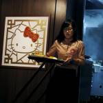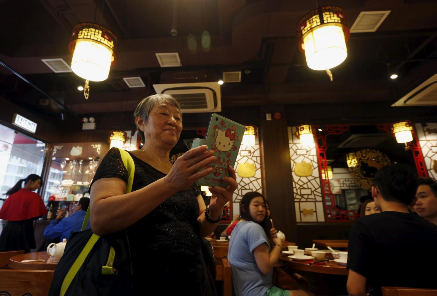 A visitor takes pictures with her tablet in a Hello Kitty-themed Chinese restaurant in Hong Kong, China May 21, 2015. The world's first Chinese-style restaurant dedicated to the Japanese cartoon has been packed out daily despite not officially opening until June 1, 2015. The eatery features some 37 dishes such as dim sum and fried rice, often served in the shape of the girl-cat. Picture taken May 21, 2015. REUTERS/Bobby Yip
