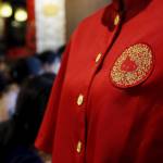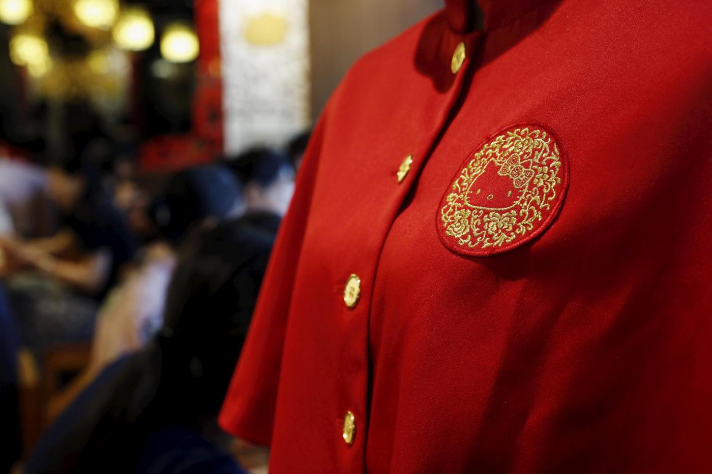 A Hello Kitty image is seen on the uniform of a waitress at a Hello Kitty-themed Chinese restaurant in Hong Kong, China May 21, 2015. The world's first Chinese-style restaurant dedicated to the Japanese cartoon has been packed out daily despite not officially opening until June 1, 2015. The eatery features some 37 dishes such as dim sum and fried rice, often served in the shape of the girl-cat. Picture taken May 21, 2015. REUTERS/Bobby Yip