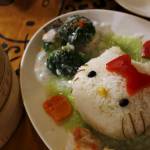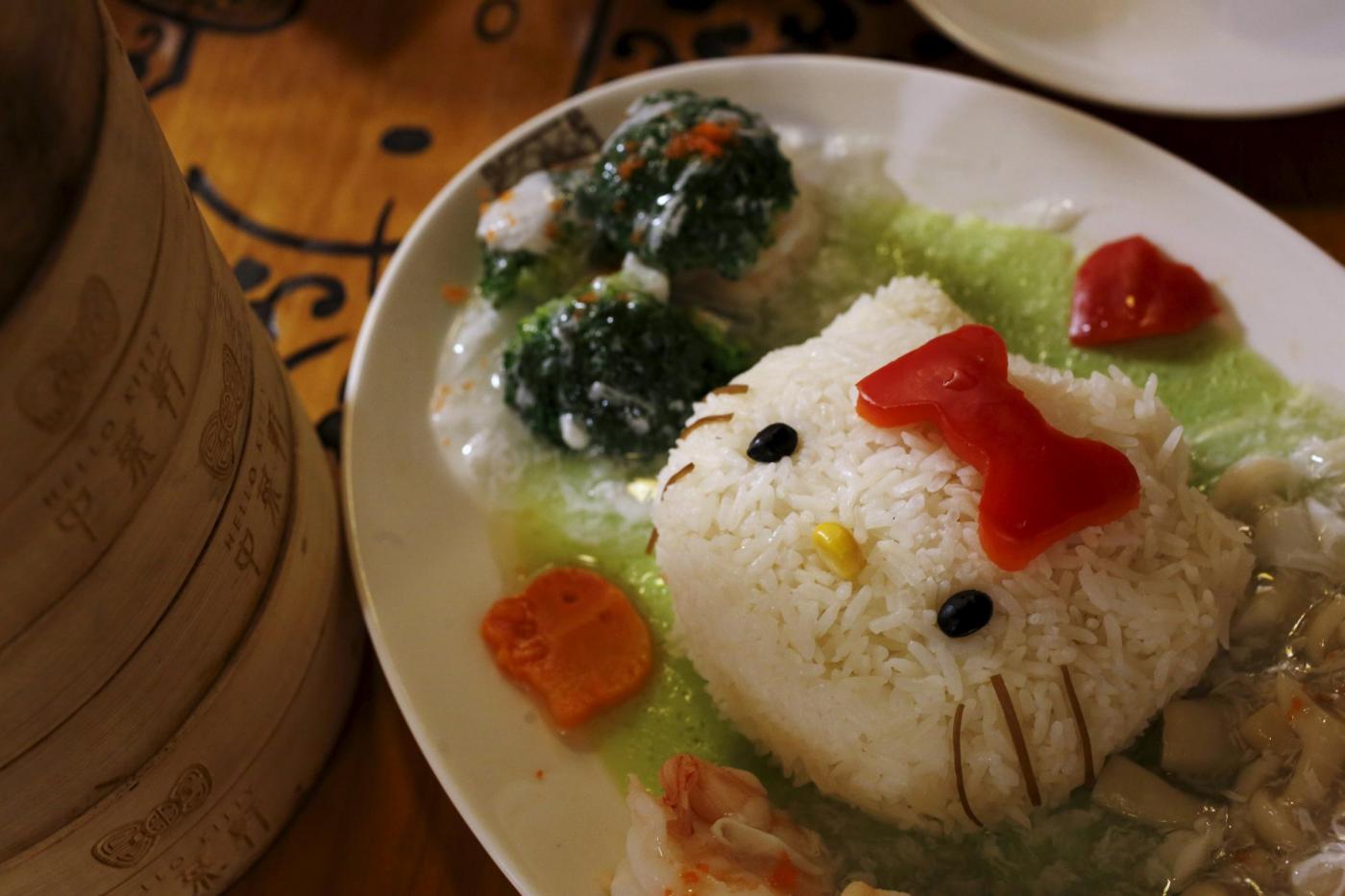 A decorated dish of rice with spinach sauce and egg white is seen at a Hello Kitty-themed Chinese restaurant in Hong Kong, China May 21, 2015. The world's first Chinese-style restaurant dedicated to the Japanese cartoon has been packed out daily despite not officially opening until June 1, 2015. The eatery features some 37 dishes such as dim sum and fried rice, often served in the shape of the girl-cat. Picture taken May 21, 2015. REUTERS/Bobby Yip