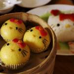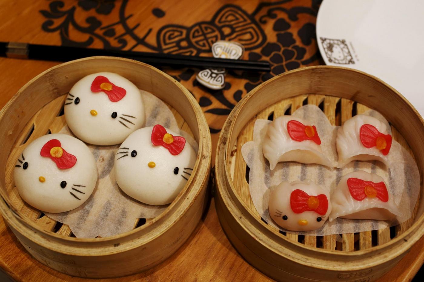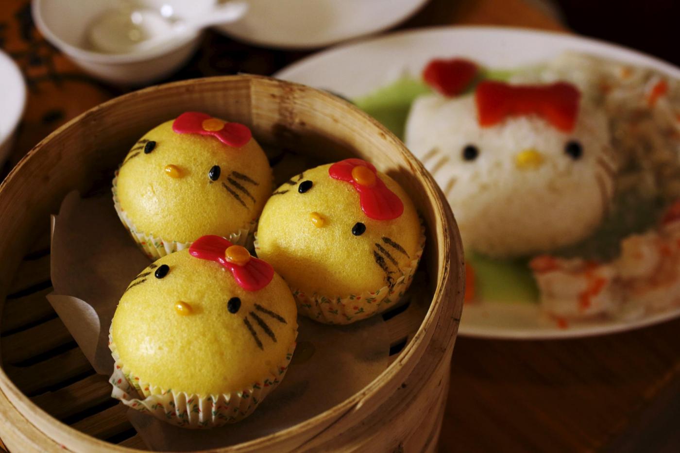 Decorated buns (L) and shrimp dumplings are seen at a Hello Kitty-themed Chinese restaurant in Hong Kong, China May 21, 2015. The world's first Chinese-style restaurant dedicated to the Japanese cartoon has been packed out daily despite not officially opening until June 1, 2015. The eatery features some 37 dishes such as dim sum and fried rice, often served in the shape of the girl-cat. Picture taken May 21, 2015. REUTERS/Bobby Yip