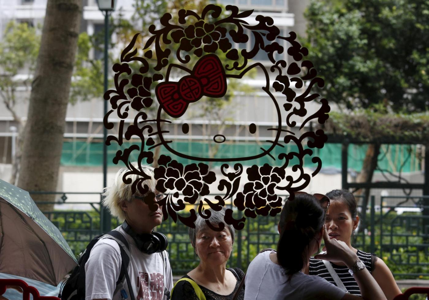 Customers queue outside a Hello Kitty-themed Chinese restaurant in Hong Kong, China May 21, 2015. The world's first Chinese-style restaurant dedicated to the Japanese cartoon has been packed out daily despite not officially opening until June 1, 2015. The eatery features some 37 dishes such as dim sum and fried rice, often served in the shape of the girl-cat. Picture taken May 21, 2015. REUTERS/Bobby Yip
