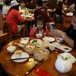 A family takes pictures as they dine in a Hello Kitty-themed Chinese restaurant in Hong Kong, China May 21, 2015. The world's first Chinese-style restaurant dedicated to the Japanese cartoon has been packed out daily despite not officially opening until June 1, 2015. The eatery features some 37 dishes such as dim sum and fried rice, often served in the shape of the girl-cat. Picture taken May 21, 2015. REUTERS/Bobby Yip