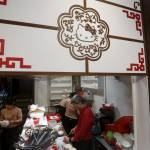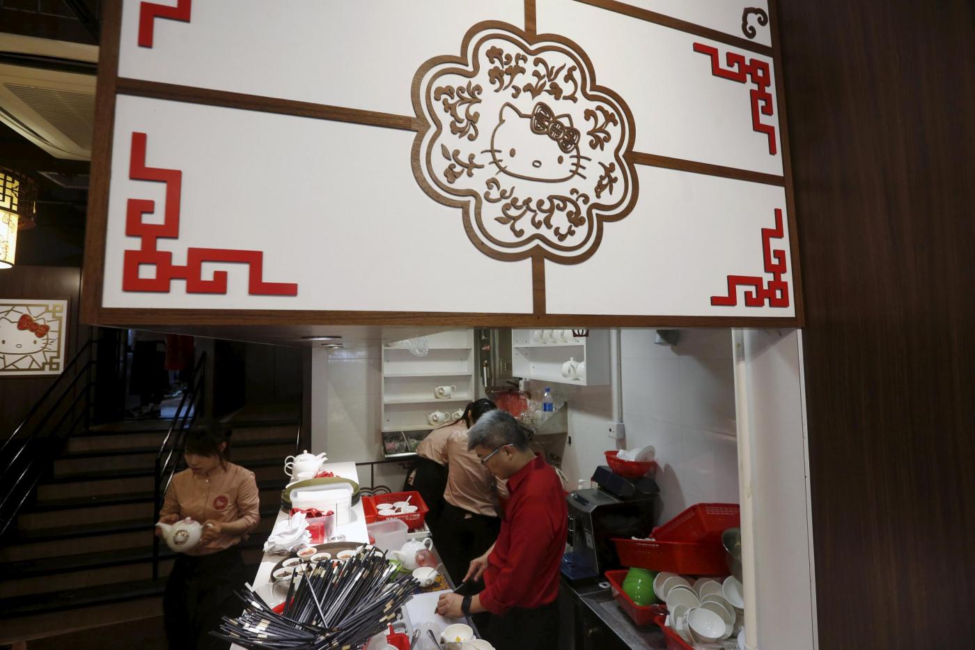 Chefs and waiters are pictured at work in a Hello Kitty-themed Chinese restaurant in Hong Kong, China May 21, 2015. The world's first Chinese-style restaurant dedicated to the Japanese cartoon has been packed out daily despite not officially opening until June 1, 2015. The eatery features some 37 dishes such as dim sum and fried rice, often served in the shape of the girl-cat. Picture taken May 21, 2015. REUTERS/Bobby Yip