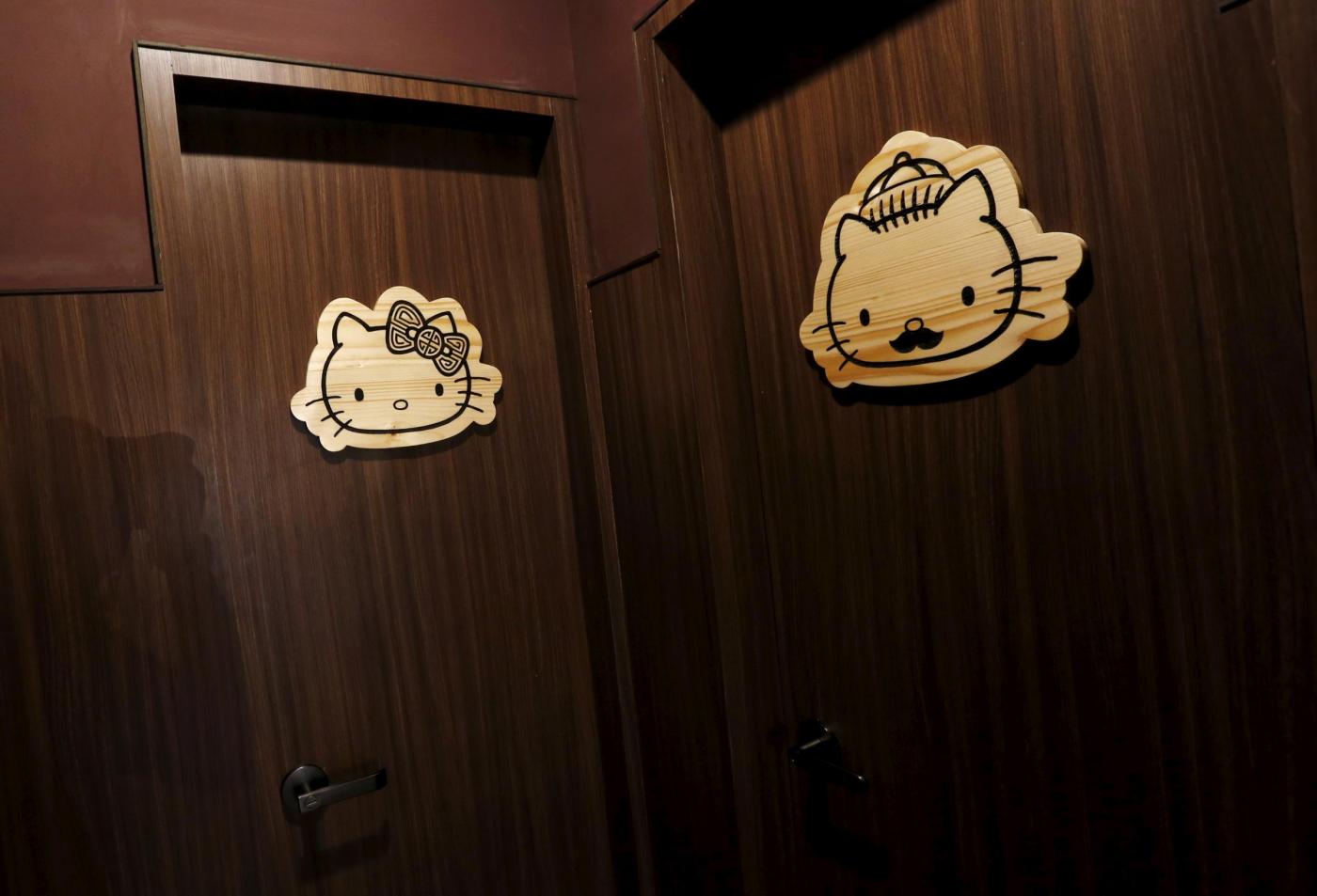 A view shows signs at the toilets of a Hello Kitty-themed Chinese restaurant in Hong Kong, China May 21, 2015. The world's first Chinese-style restaurant dedicated to the Japanese cartoon has been packed out daily despite not officially opening until June 1, 2015. The eatery features some 37 dishes such as dim sum and fried rice, often served in the shape of the girl-cat. Picture taken May 21, 2015. REUTERS/Bobby Yip