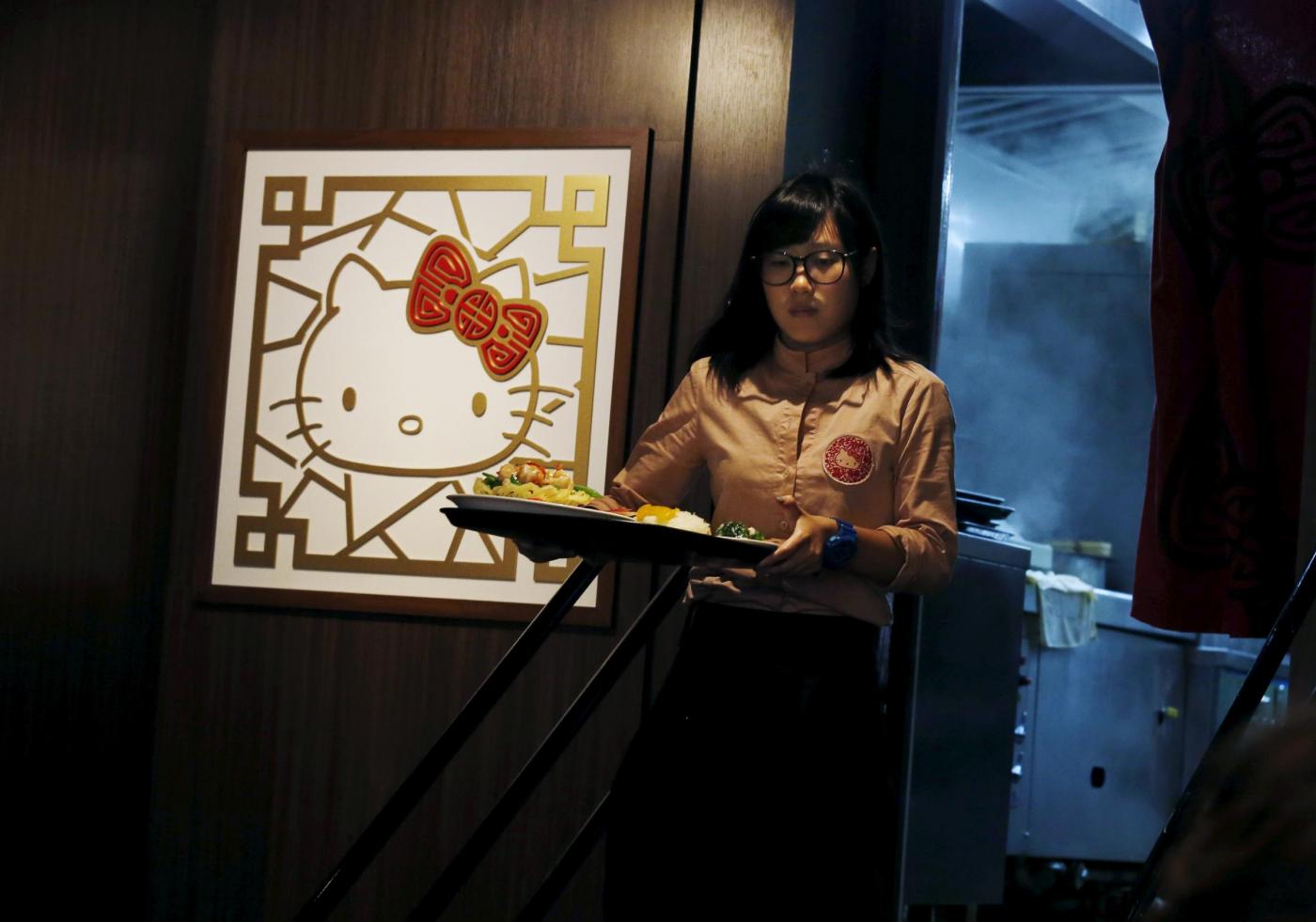 A waitress brings dishes out from the kitchen at a Hello Kitty-themed Chinese restaurant in Hong Kong, China May 21, 2015. The world's first Chinese-style restaurant dedicated to the Japanese cartoon has been packed out daily despite not officially opening until June 1, 2015. The eatery features some 37 dishes such as dim sum and fried rice, often served in the shape of the girl-cat. Picture taken May 21, 2015. REUTERS/Bobby Yip