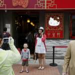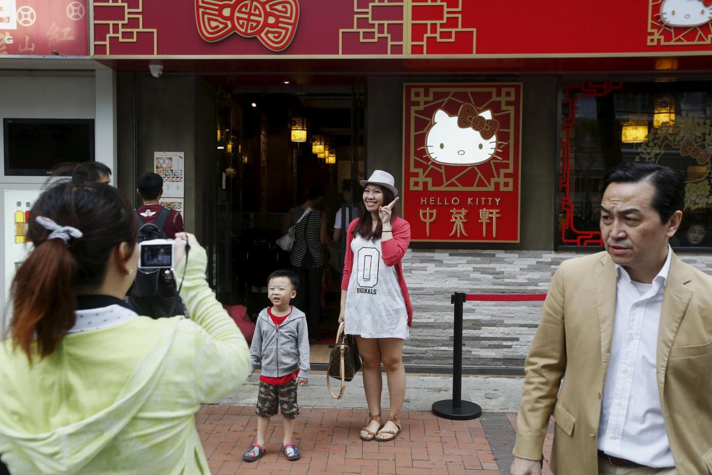 Customers take pictures as they wait for an available table outside a Hello Kitty-themed Chinese restaurant in Hong Kong, China May 21, 2015. The world's first Chinese-style restaurant dedicated to the Japanese cartoon has been packed out daily despite not officially opening until June 1, 2015. The eatery features some 37 dishes such as dim sum and fried rice, often served in the shape of the girl-cat. Picture taken May 21, 2015. REUTERS/Bobby Yip