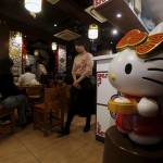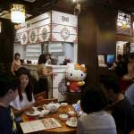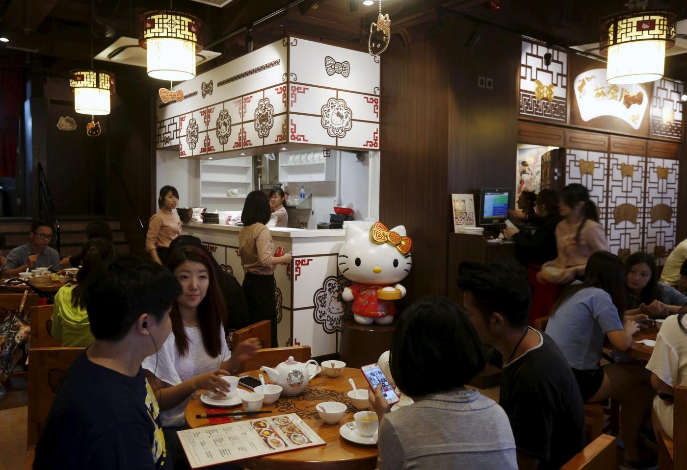 Diners eat lunch at a Hello Kitty-themed Chinese restaurant in Hong Kong, China May 21, 2015. The world's first Chinese-style restaurant dedicated to the Japanese cartoon has been packed out daily despite not officially opening until June 1, 2015. The eatery features some 37 dishes such as dim sum and fried rice, often served in the shape of the girl-cat. Picture taken May 21, 2015. REUTERS/Bobby Yip