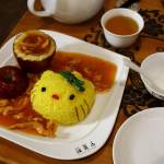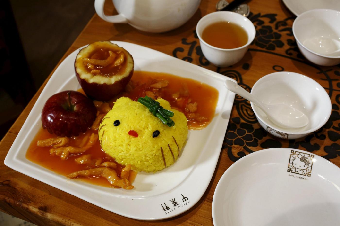 A decorated dish of rice with pork and apple is seen at a Hello Kitty-themed Chinese restaurant in Hong Kong, China May 21, 2015. The world's first Chinese-style restaurant dedicated to the Japanese cartoon has been packed out daily despite not officially opening until June 1, 2015. The eatery features some 37 dishes such as dim sum and fried rice, often served in the shape of the girl-cat. Picture taken May 21, 2015. REUTERS/Bobby Yip