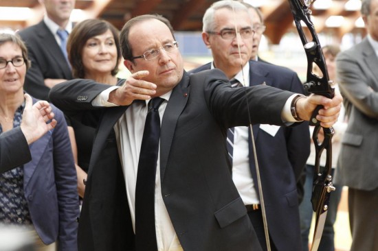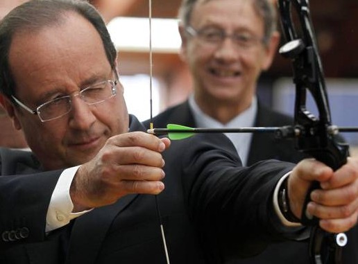 Il capo dell’Eliseo era in visita al Consiglio nazionale dello Sport per salutare gli atleti francesi che andranno ai Giochi Olimpici di Londra 2012: qui, Francois Hollande ha tirato alcune frecce con l’arco, un’immagine rigorosamente ripresa dalle telecamere e che sta facendo il giro del web.