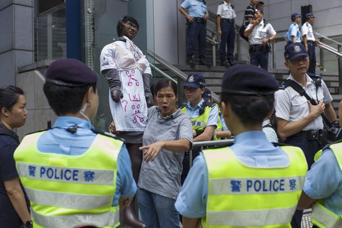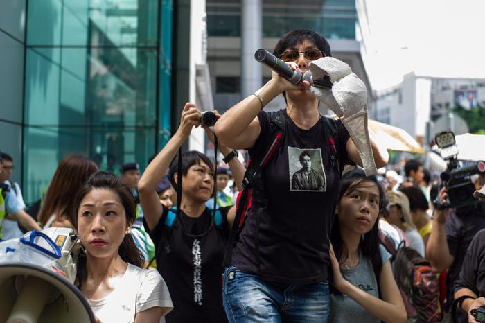 epa04869485 An activist chants slogans during a protest outside the Wanchai Police Station in Hong Kong, China, 02 August 2015. Protesters rallied in support of protester Ng Lai-ying who was given a three-and-a-half month jail sentence for 'assaulting' the police with her breasts during a protest earlier this year. She is currently out on bail pending appeal. EPA/JEROME FAVRE