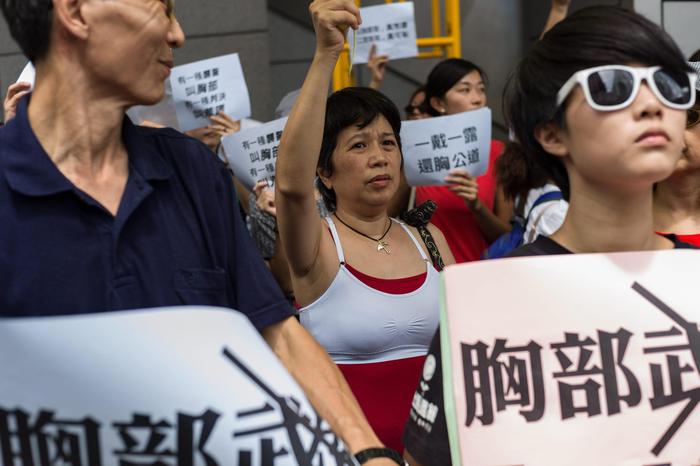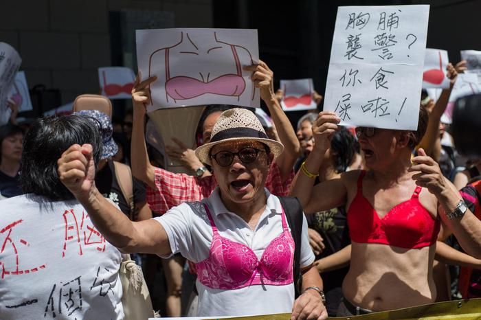 epa04869484 Activists chant slogans while wearing bras during a protest outside the Wanchai Police Station in Hong Kong, China, 02 August 2015. Protesters rallied in support of protester Ng Lai-ying who was given a three-and-a-half month jail sentence for 'assaulting' the police with her breasts during a protest earlier this year. She is currently out on bail pending appeal. EPA/JEROME FAVRE